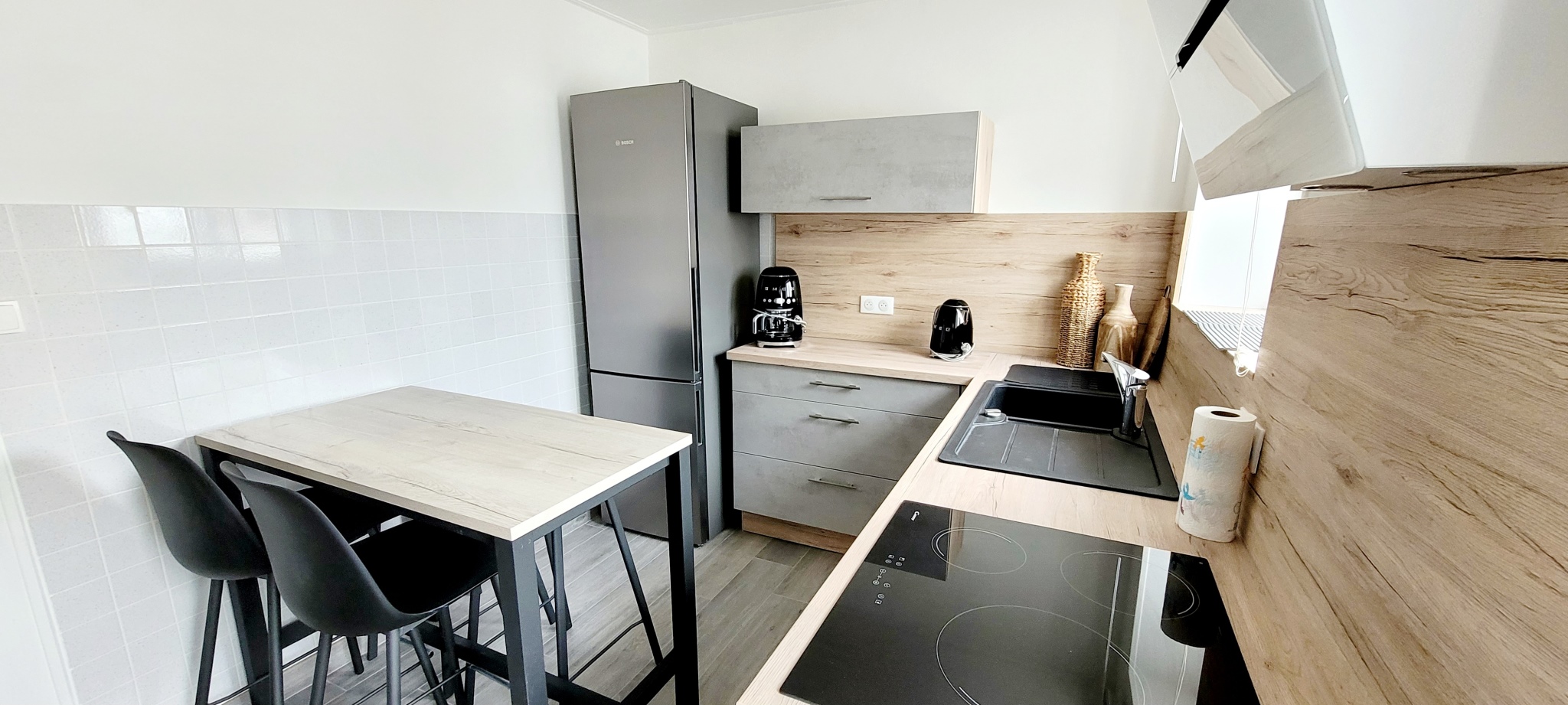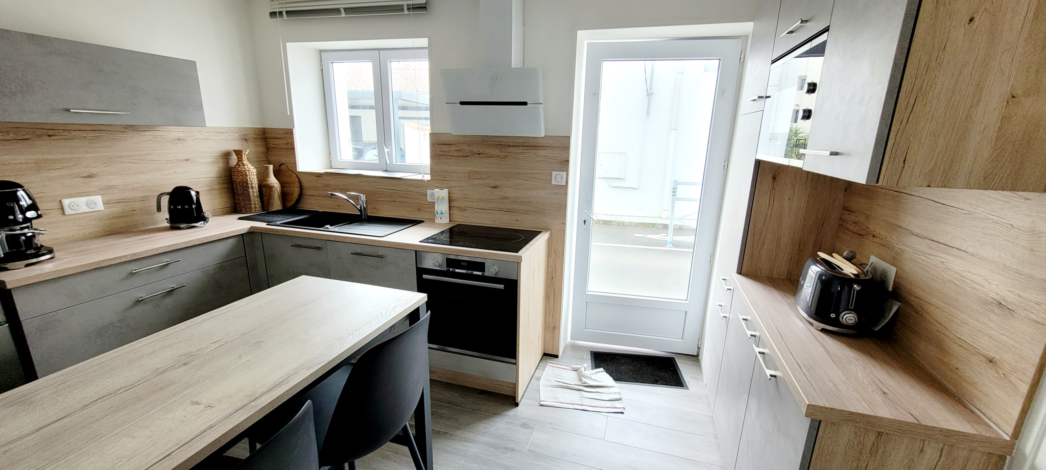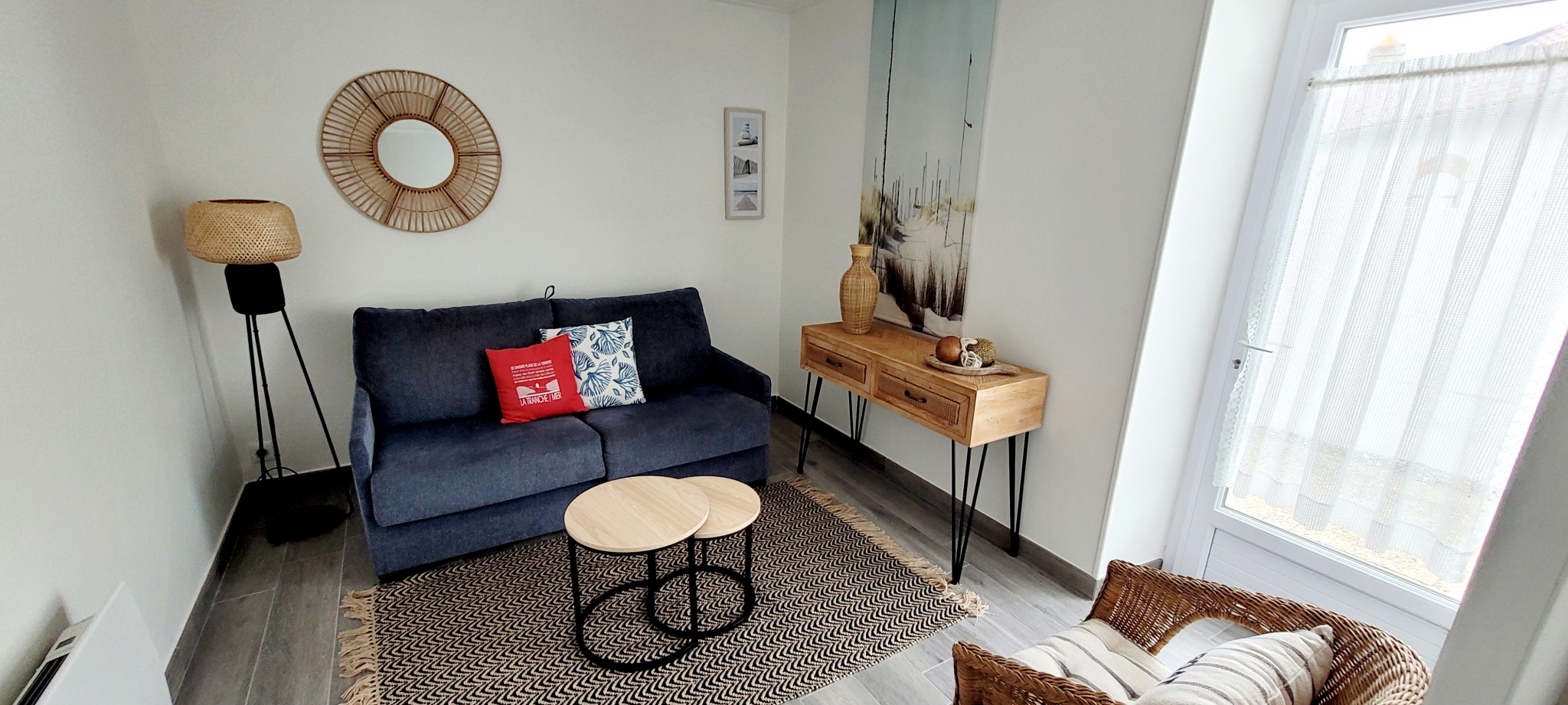 Petite maison individuelle rénovée mitoyenne avec cour de sable clôturée idéal pour tout faire à pied, Rue du fonds martin, La Tranche sur Mer - Plage à 100 m, Commerces à 300 m. Une cuisine (réfrigérateur, micro-ondes, plaques induction, lave-vaisselle, four électrique, téléviseur) 1 chambre/salon (canapé BZ) et chambre cabine (1 lit 140), salle d'eau ( douche, lavabo et W.C, lave-linge), salon de jardin, parking dans la cour - cour de sable avec salon de jardin. Linge de maison et ménage de départ non compris. Possibilité d'y souscrire en option. Chèques vacances acceptés. Plan Prévision Risque Littoral : Zone Blanche