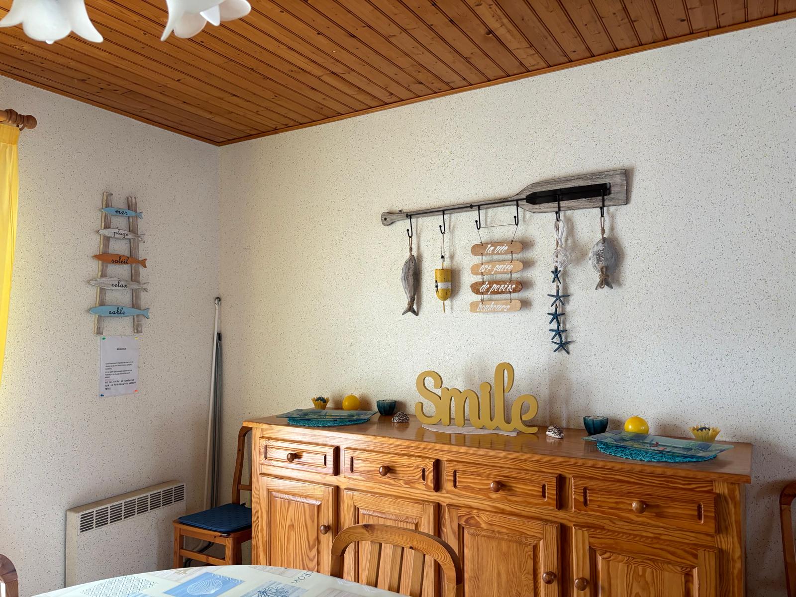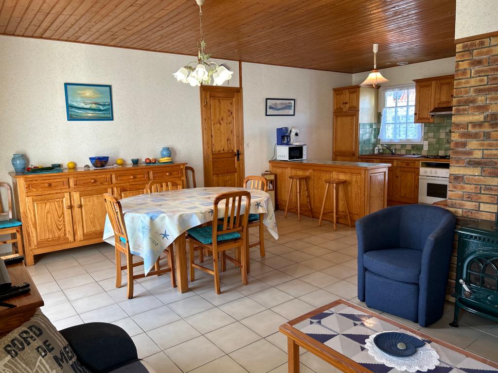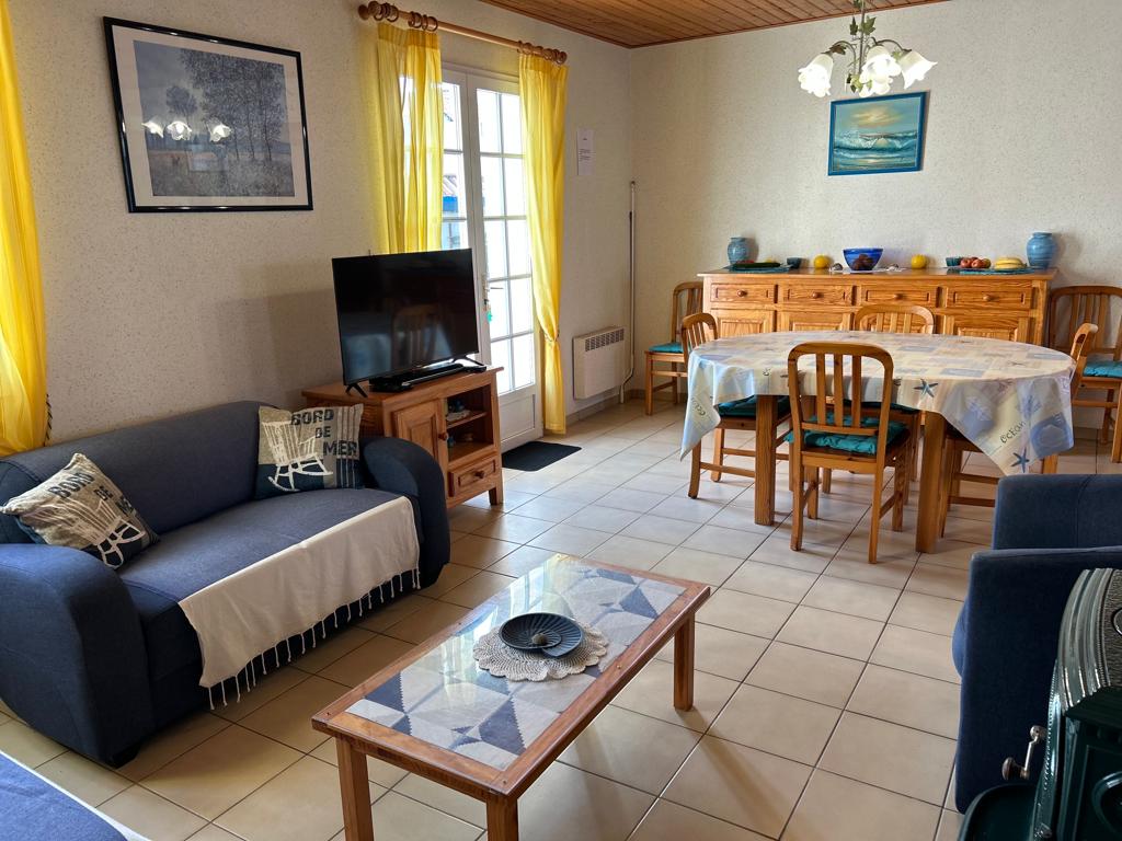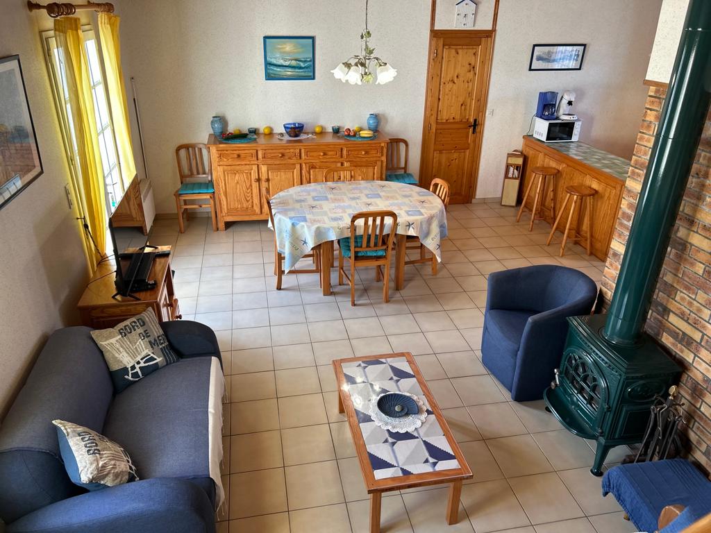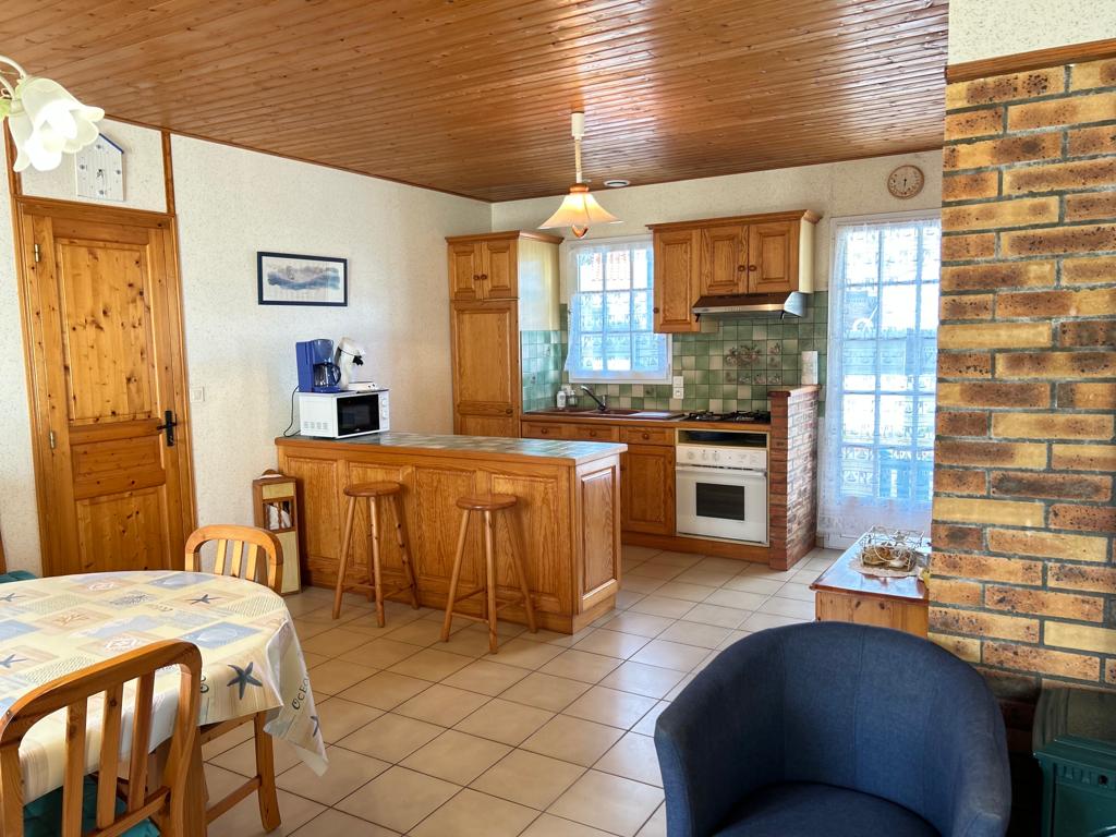 Maison indépendante plain pied bien entretenue, très belle terrasse au sud composée d'un séjour/salon (WIFI – TV et DVD) avec coin cuisine (plaques cuisson mixtes, four électrique, micro-onde, réfrigérateur, congélateur, lave-vaisselle) 1 chambre avec 1 lit 140, 1 chambre avec 2 lits superposés et 1 canapé BZ, salle d’eau (douche, lavabo), WC séparé , cellier/lingerie avec lave-linge et congélateur, A l’étage 1 chambre avec 1 lit 160. douche d’extérieur sur la terrasse, belle et grande terrasse avec store banne 2 emplacements voiture. Cabanon de jardin, barbecue, Plage à 450m, Commerces à 2000m - Linge de maison et ménage de départ non compris. Possibilité d'y souscrire en option. Chèques vacances acceptés. Plan Prévision Risque Littoral : Zone Blanche