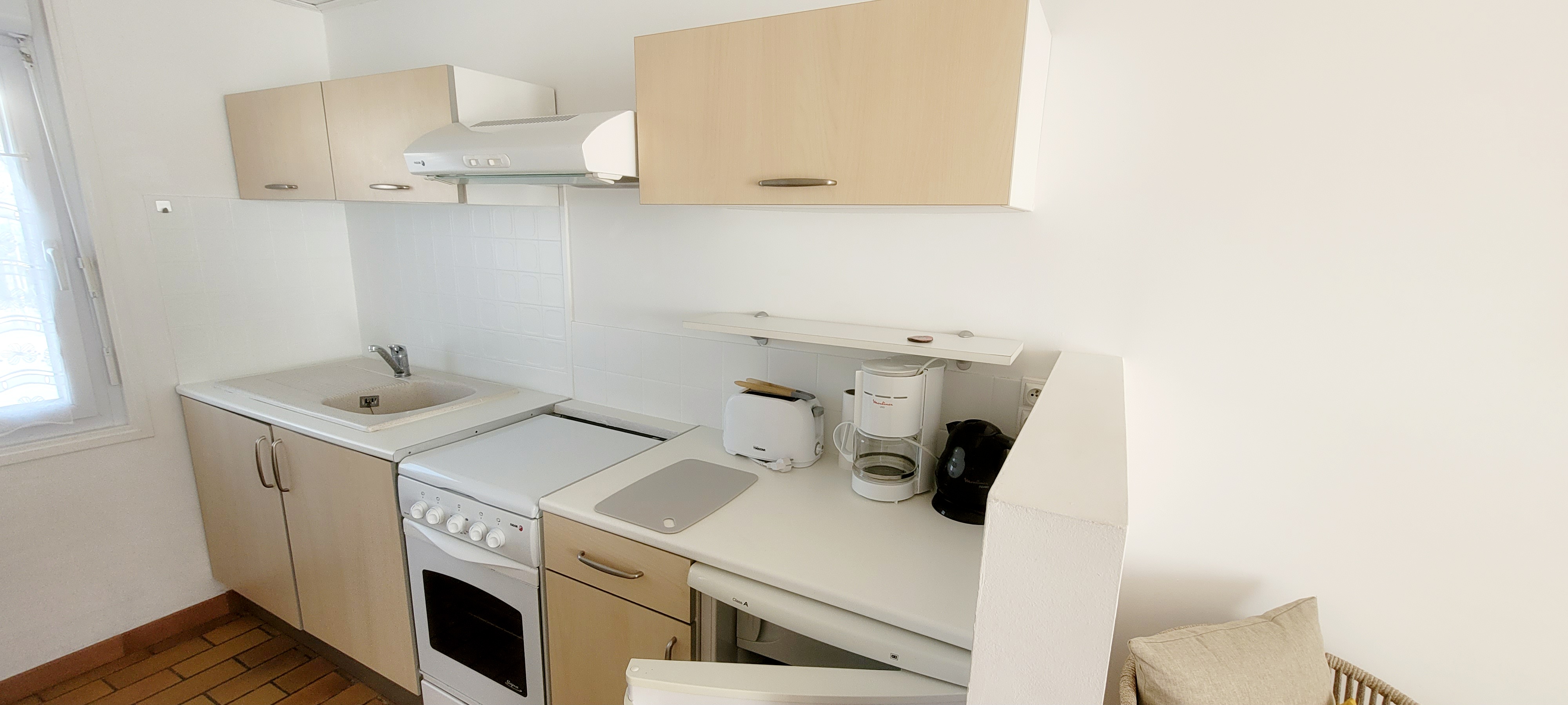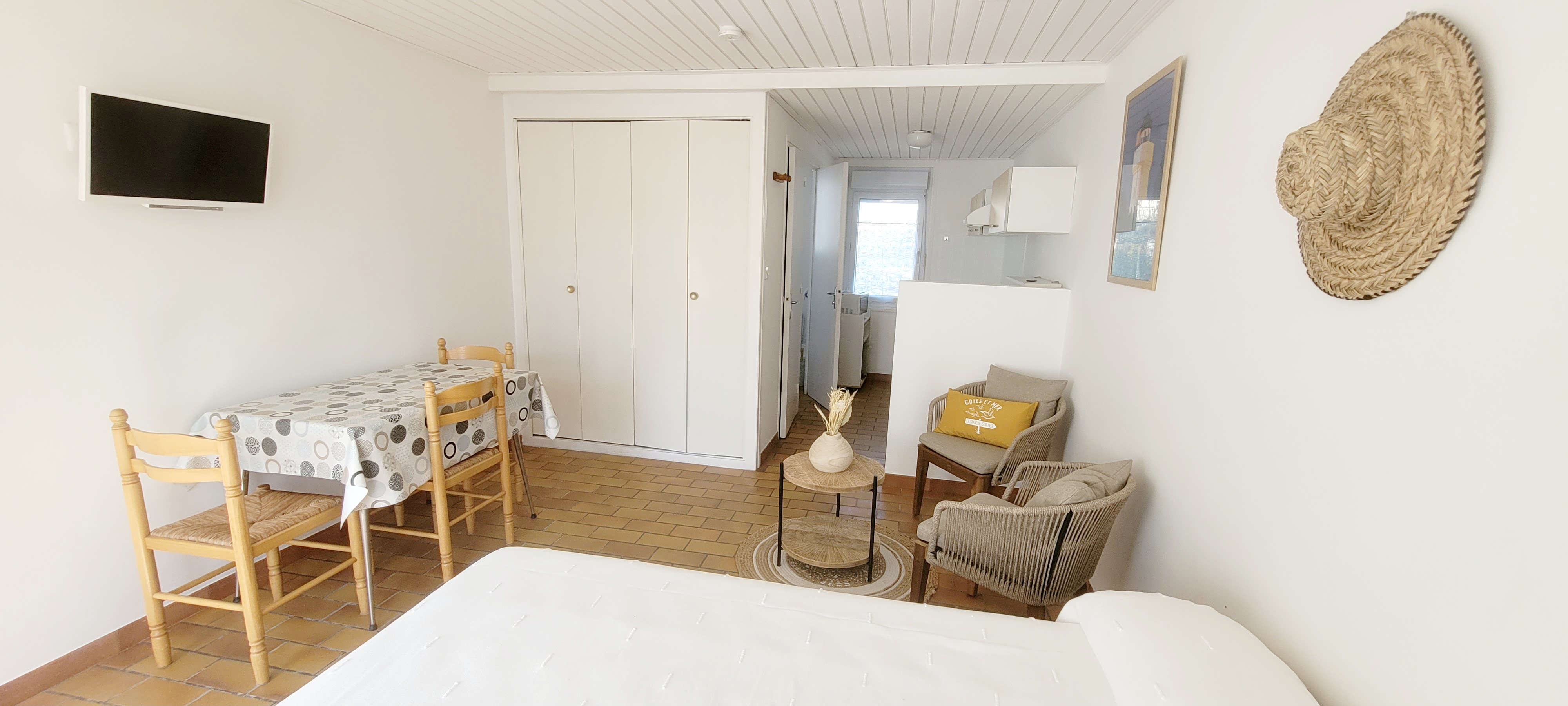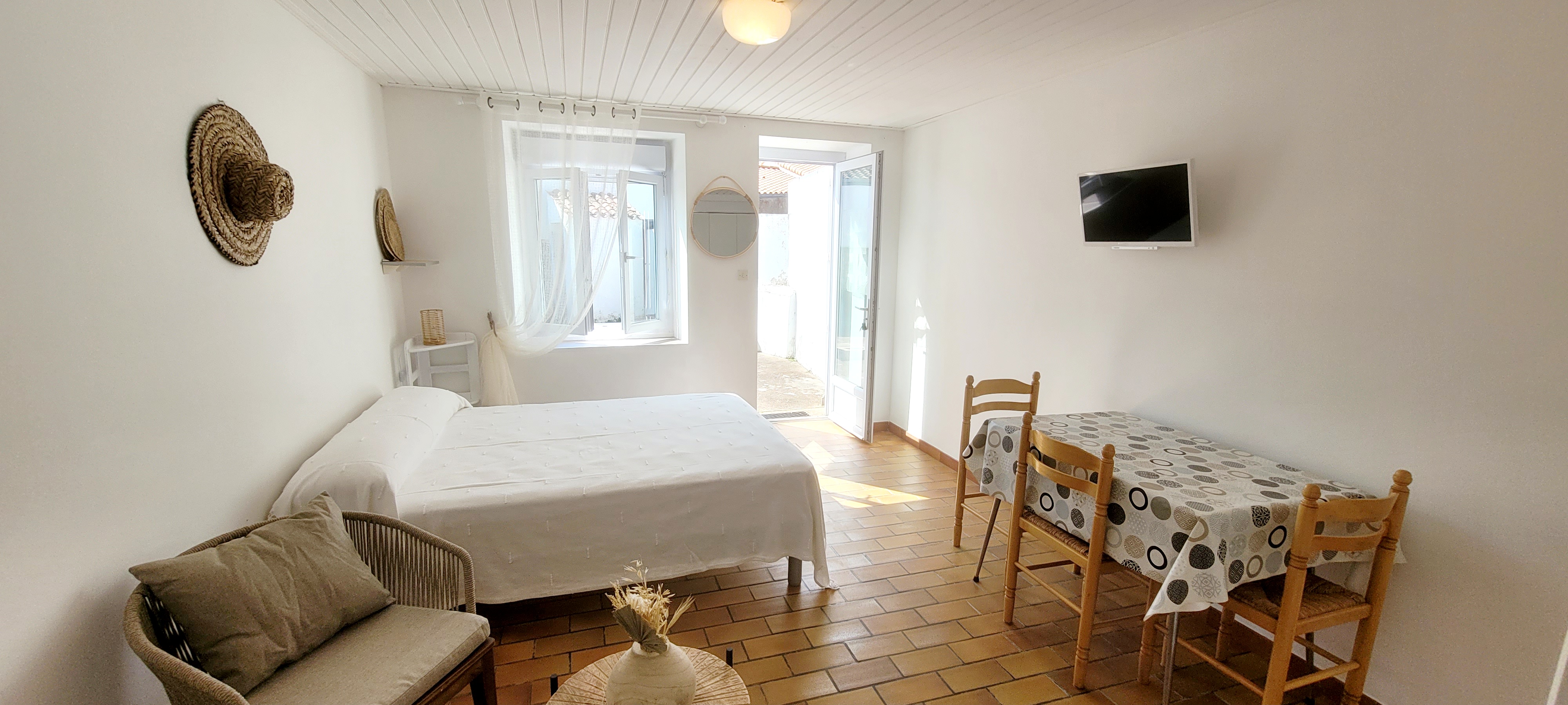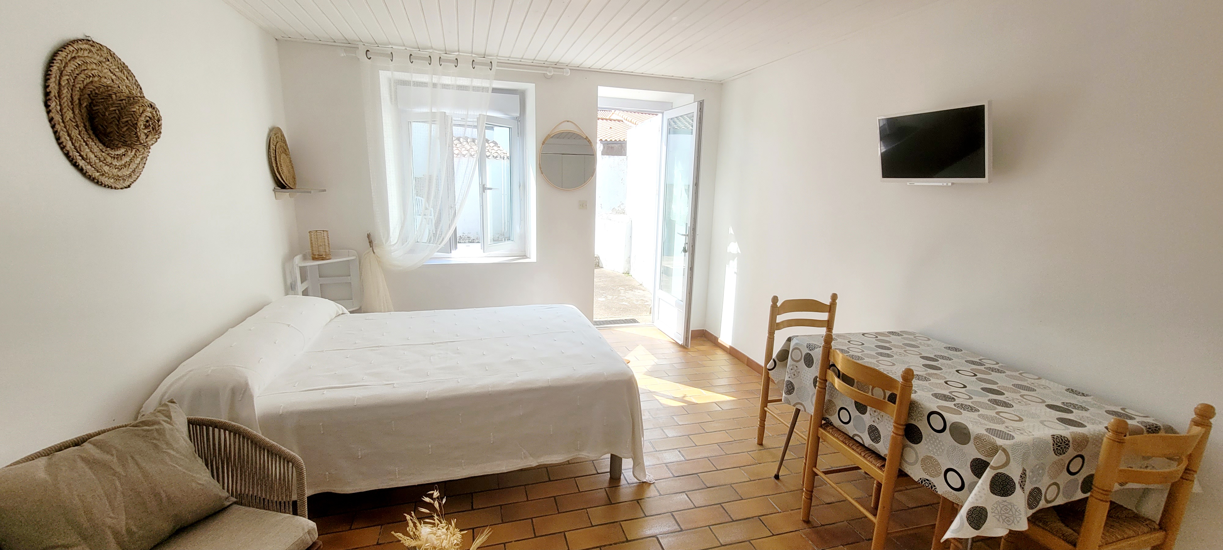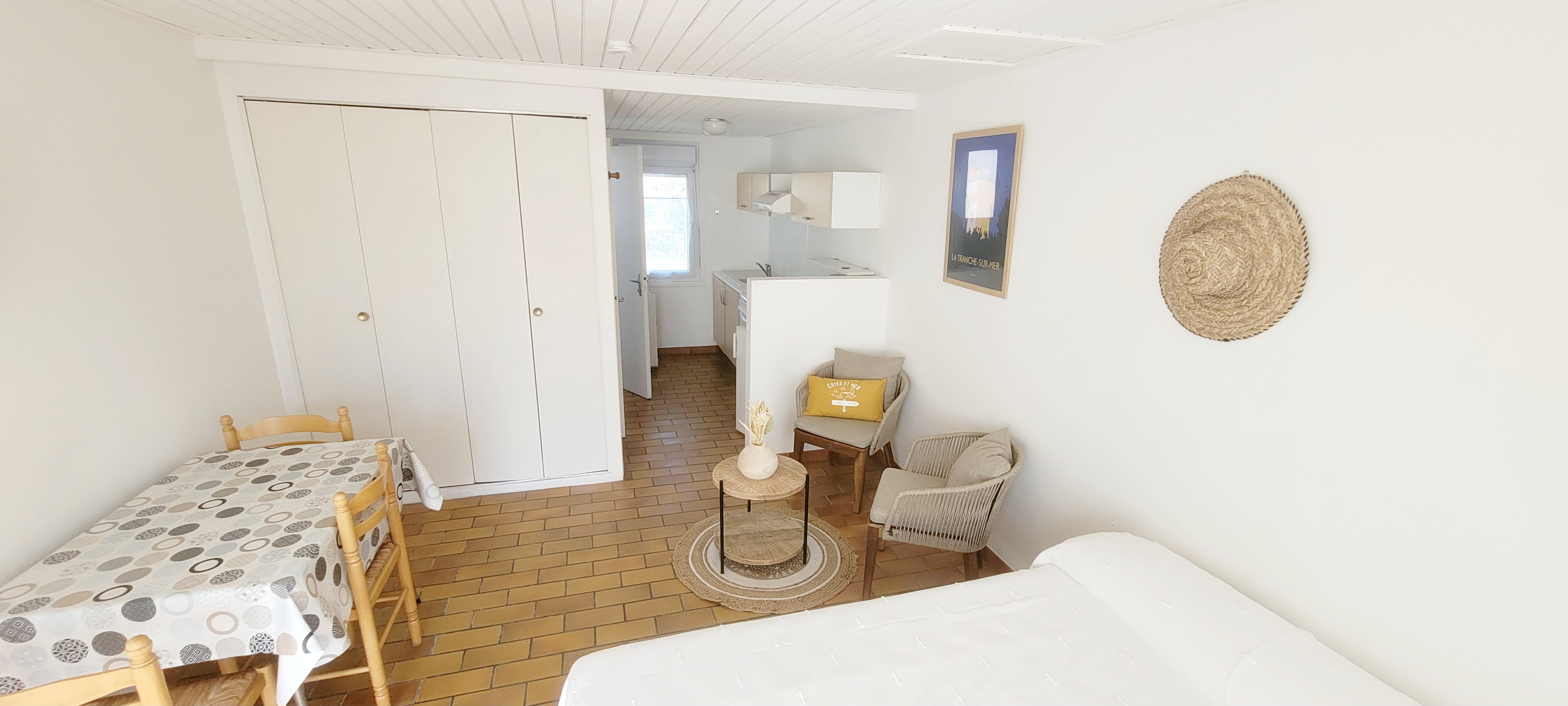 Studio de plain pied avec petite cour particulière dans le centre ville idéal pour tout faire à pied - Rue Victor Hugo, La Tranche sur Mer - Plage à 200 m, Commerces à 50 m. Séjour/ chambre avec téléviseur, 1 Lit de 140, coin cuisine (réfrigérateur, plaque cuisson, micro-onde), Salle d'eau (douche, lavabo, WC et machine à laver), terrasse avec salon de jardin - parking privé à 300 m disponible du 9/07 au 27/08 - Linge non fourni, forfait ménage en option, attention pas de chauffage, chèques vacances acceptés - Plan Prévention des Risques Littoral : Zone Blanche