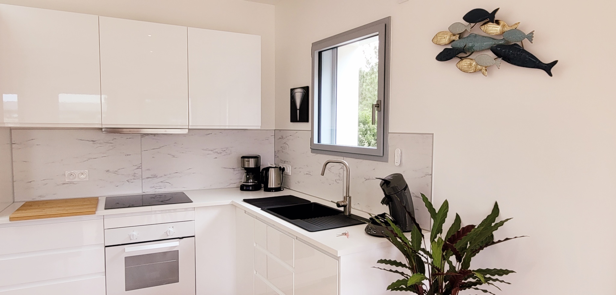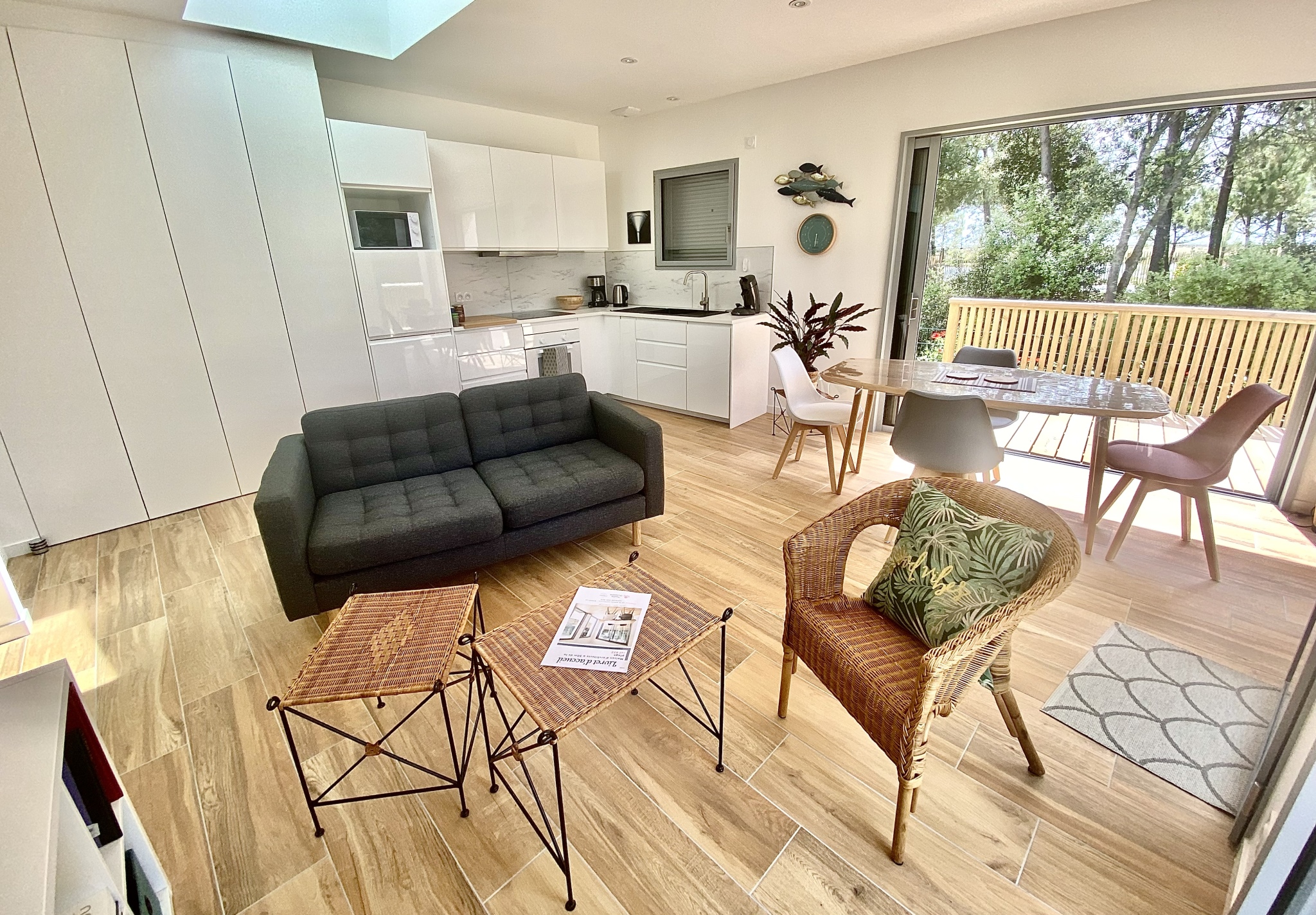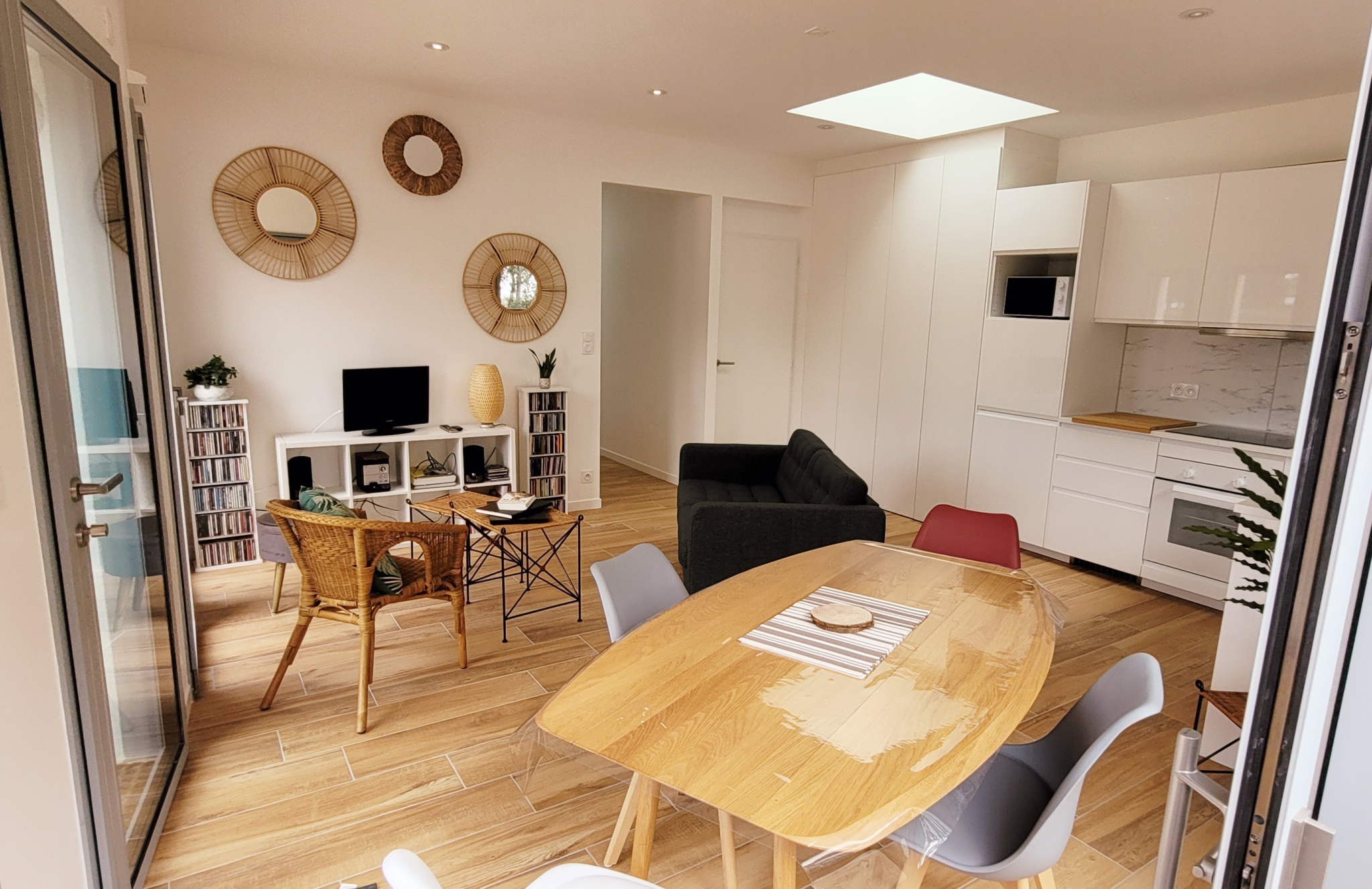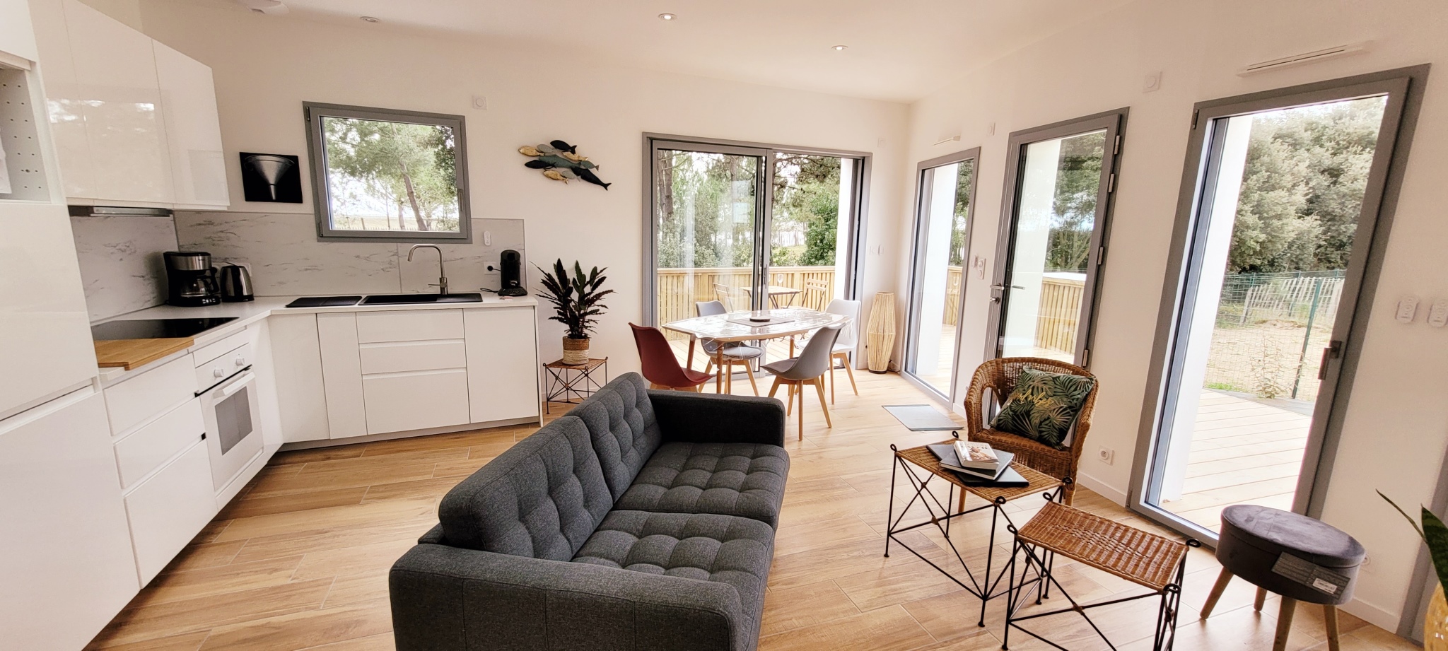 Maison d'architecte de plain-pied avec son accès direct à la plage ! Très belle prestation, cette location est composée d'un séjour, d'une cuisine ouverte équipée ( plaque induction, réfrigérateur/congél, four, micro-onde, lave vaisselle), de 2 chambres avec lits en 160cm dont 1 modulables en lits simples, d'une salle de bain avec douche à l'italienne, lavabo et WC, d'un WC séparé, d'une terrasse avec mobilier d'extérieur et barbecue / plancha au gaz. Cour fermée, douche extérieure pour les retours de plage. débarras (lave-linge) pour les vélos et place de stationnement. Accès direct sur les pistes cyclables qui mènent au centre-ville. Linge de maison et ménage de départ non compris. Possibilité d'y souscrire en option. Prévoir consommation électrique en sus hors saison d'été. Chèques vacances acceptés. Plan Prévision Risque Littoral : Zone Bleue B1