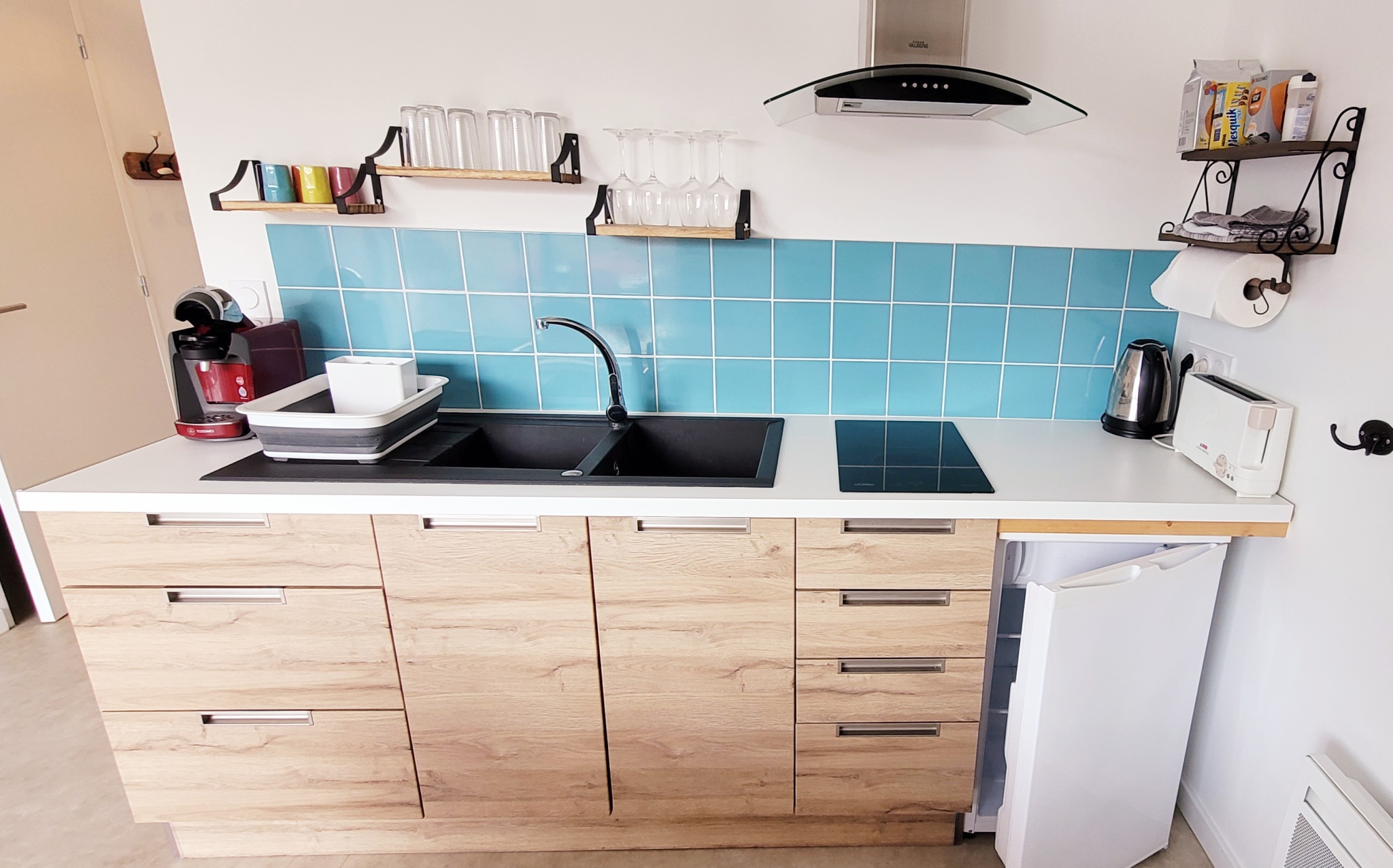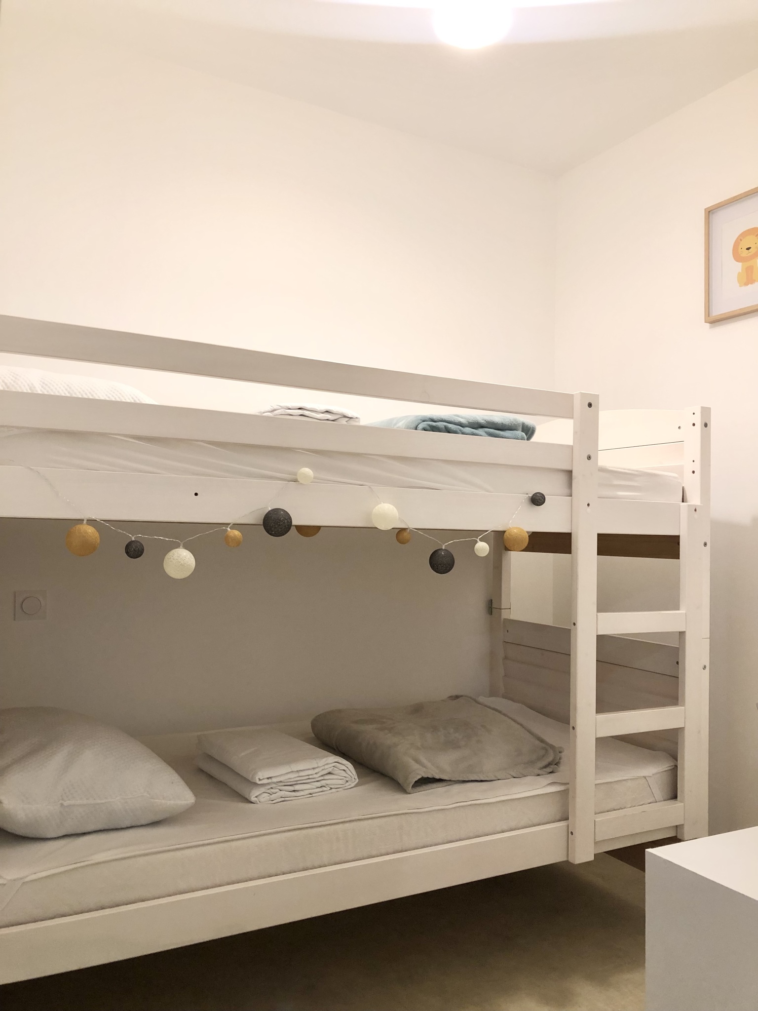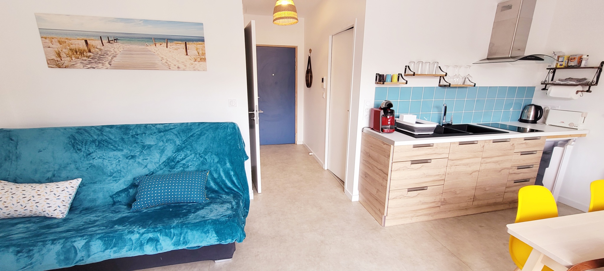 Cet appartement au premier étage de la résidence offre une belle terrasse. Il est composé d'une cuisine équipée (four, plaques de cuisson, micro-onde, réfrigérateur), d'une salle de douche avec vasque et WC, d'un espace chambre avec lits superposés (pas de fenêtre), d'un espace séjour / salle à manger avec table et chaises, clic-clac pour 2 personnes et TV.