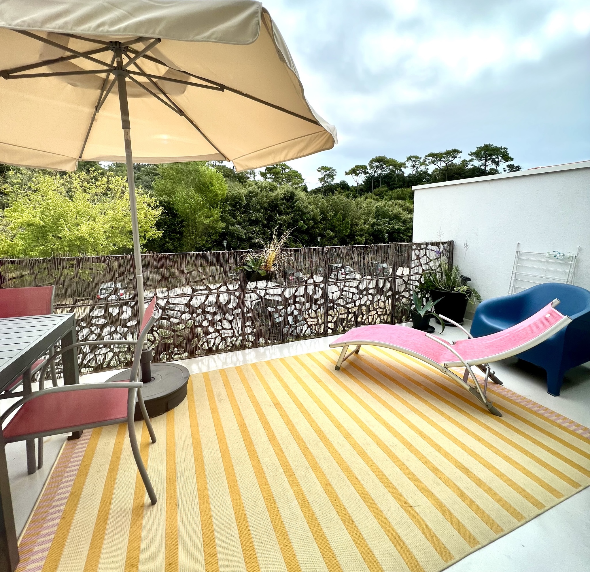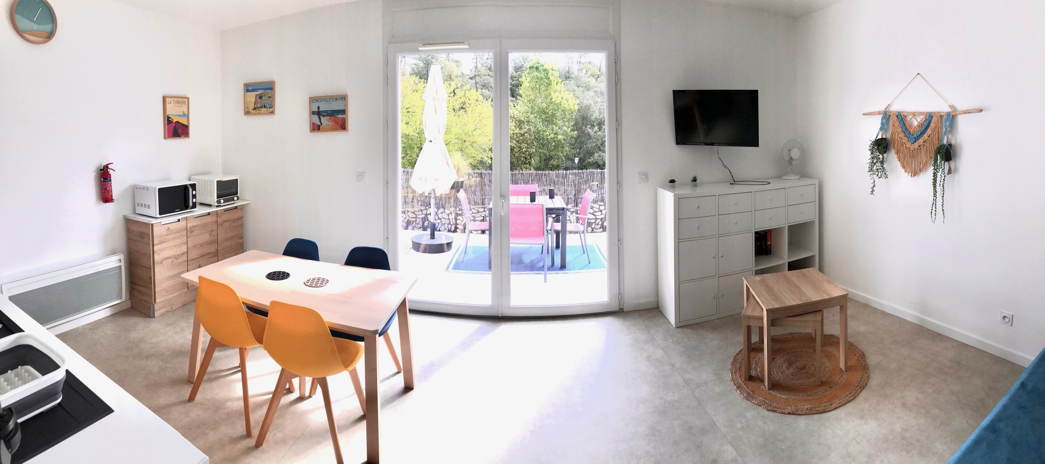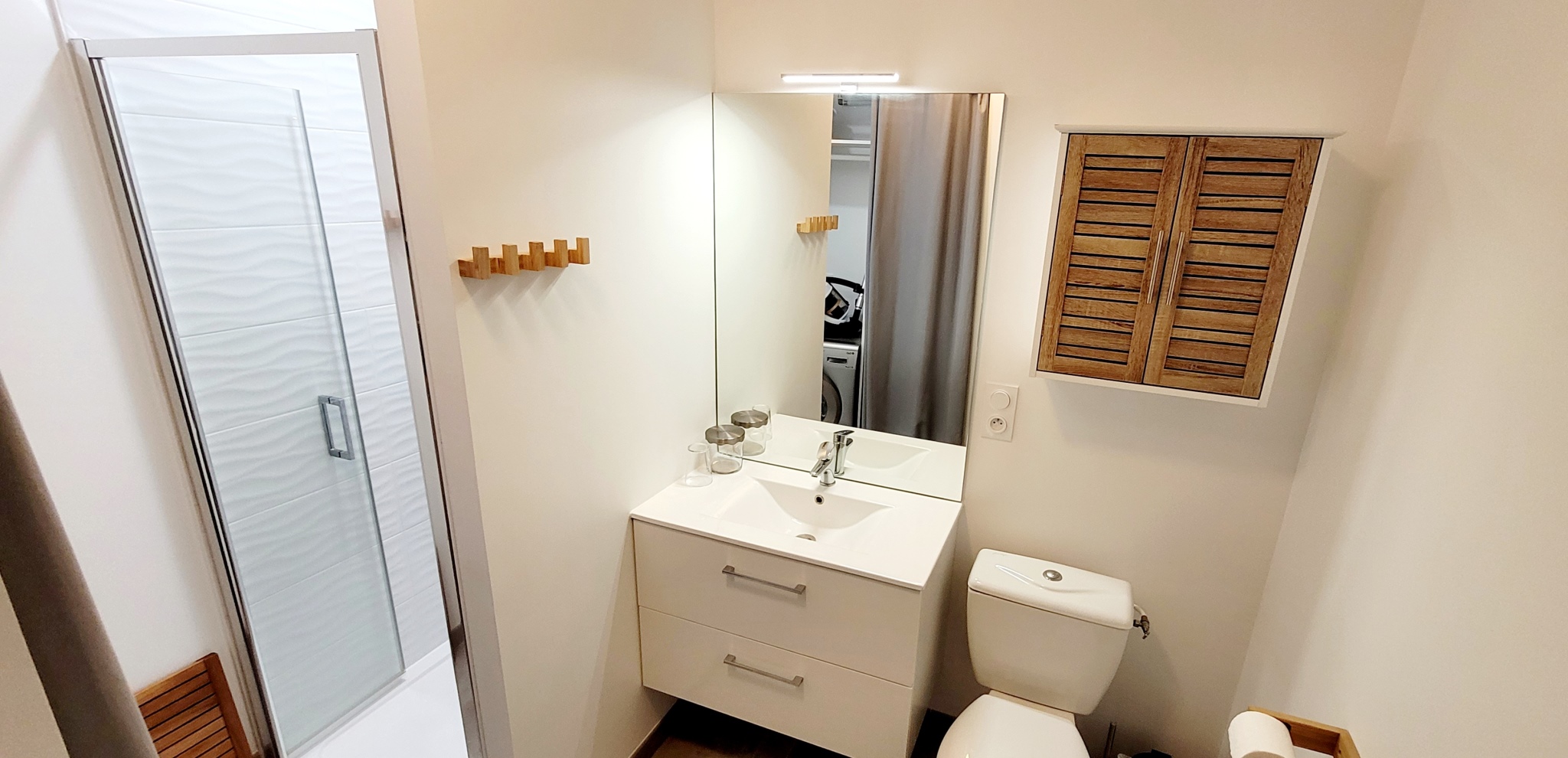 Cet appartement au premier étage de la résidence offre une belle terrasse. Il est composé d'une cuisine équipée (four, plaques de cuisson, micro-onde, réfrigérateur), d'une salle de douche avec vasque et WC, d'un espace chambre avec lits superposés (pas de fenêtre), d'un espace séjour / salle à manger avec table et chaises, clic-clac pour 2 personnes et TV.