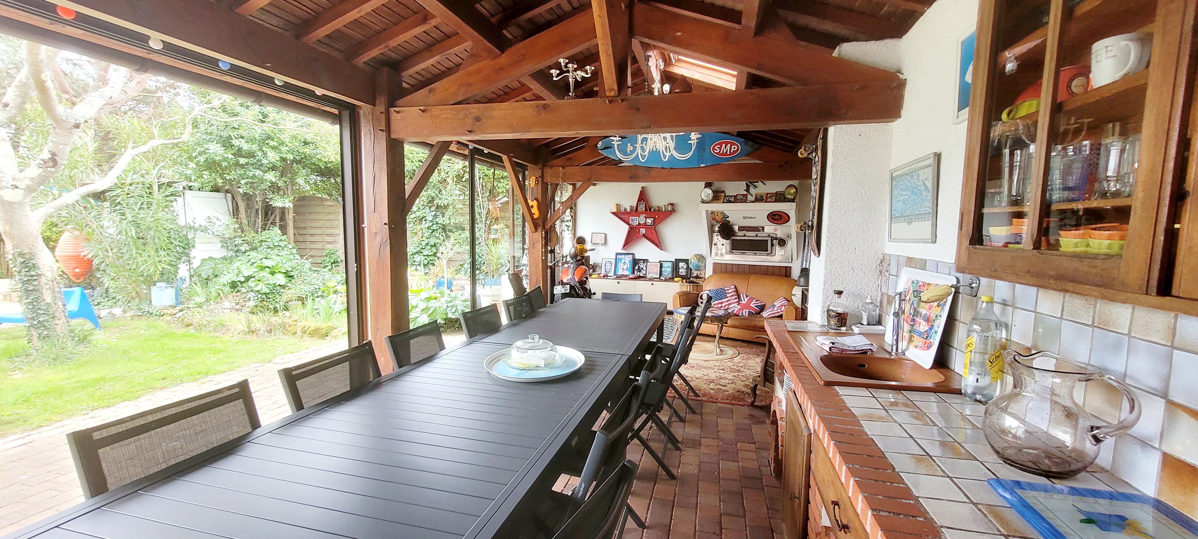 La villa bénéficie d’un grand jardin avec préau et cuisine d'été, parfaits pour des repas conviviaux en extérieur. Détendez-vous dans le jacuzzi ou profitez des nombreuses terrasses pour prendre un bain de soleil ou partager des moments de détente en famille ou entre amis. Le mobilier de jardin confortable et les espaces extérieurs bien aménagés garantissent une expérience agréable et reposante.