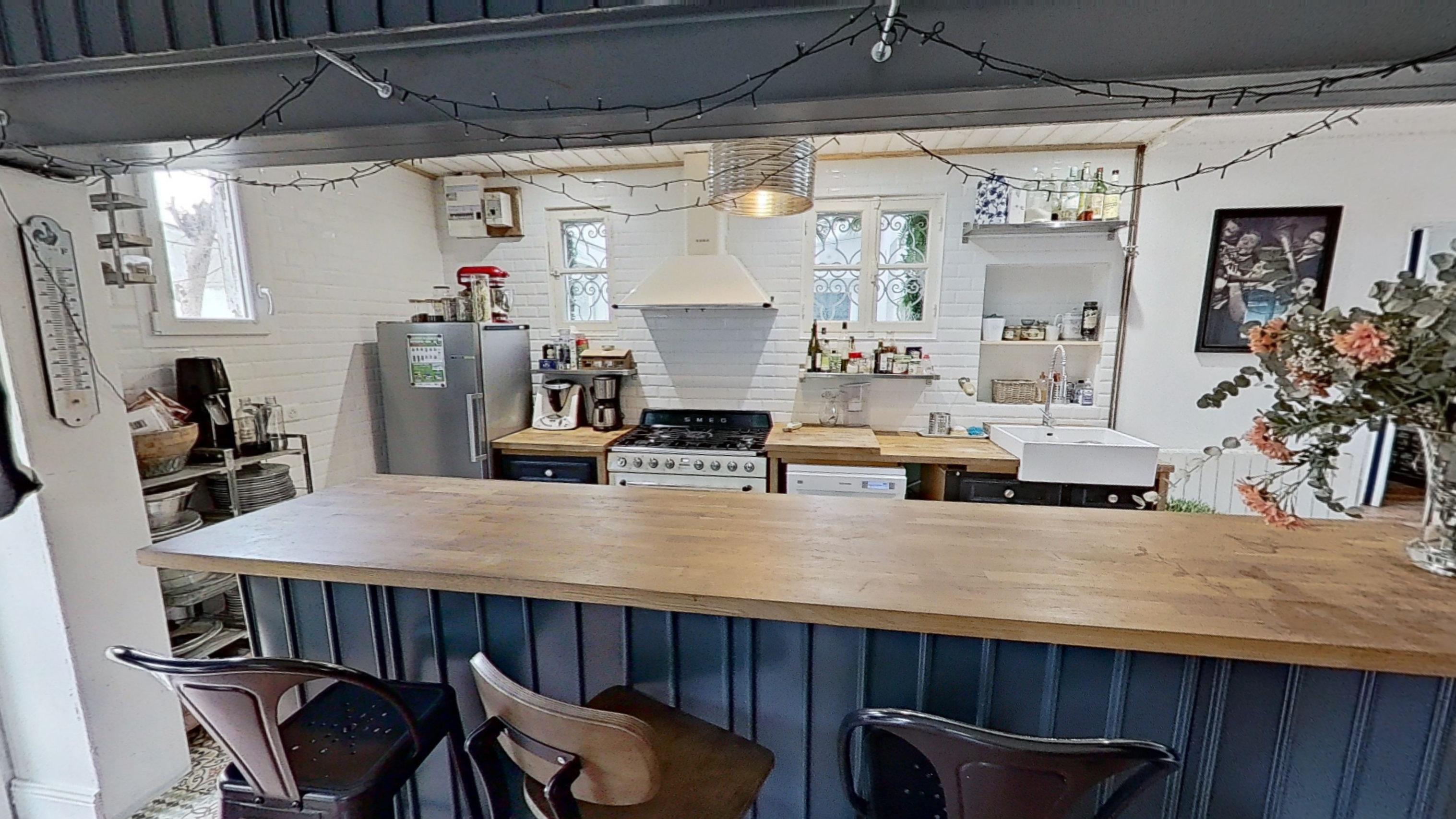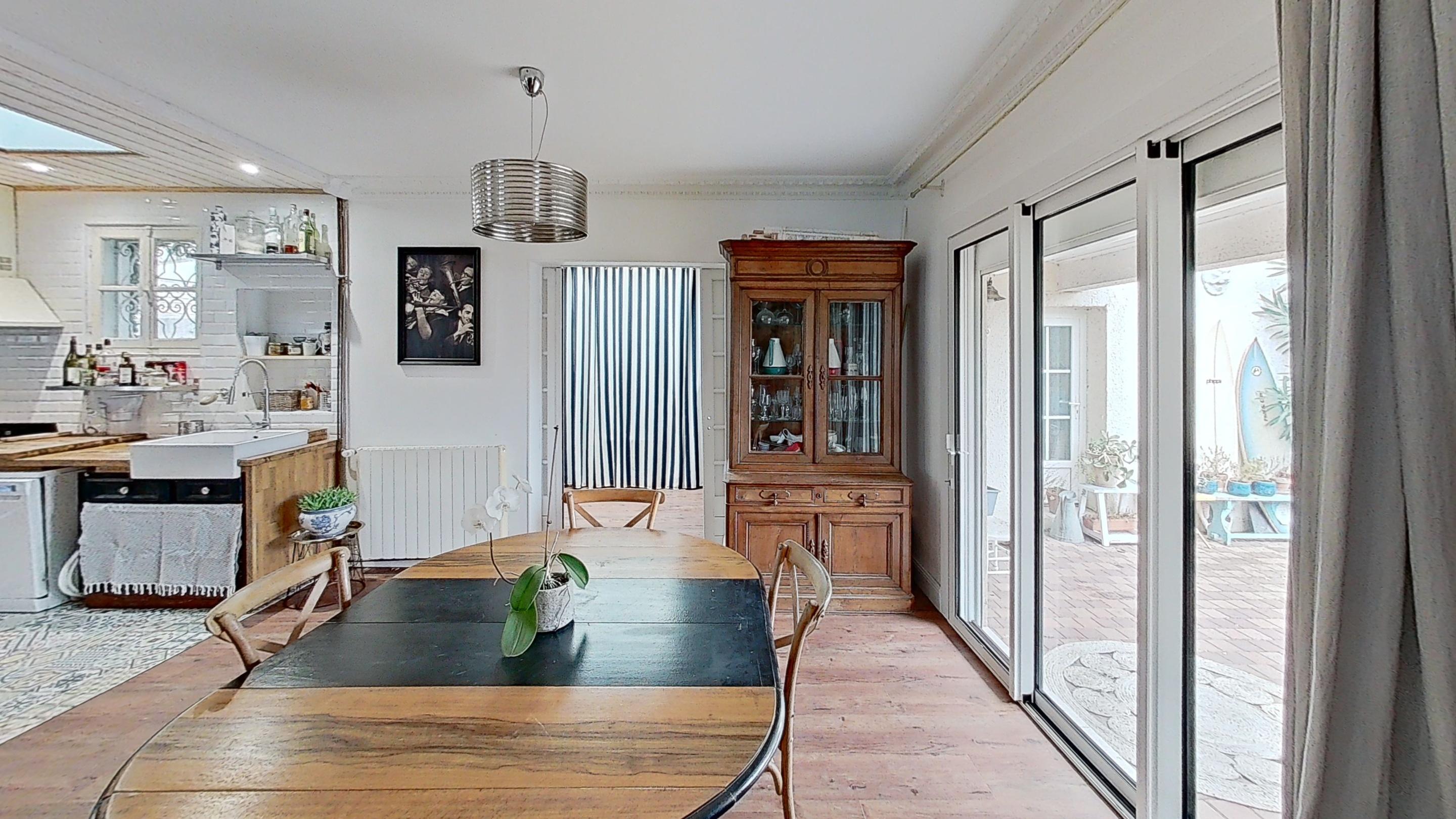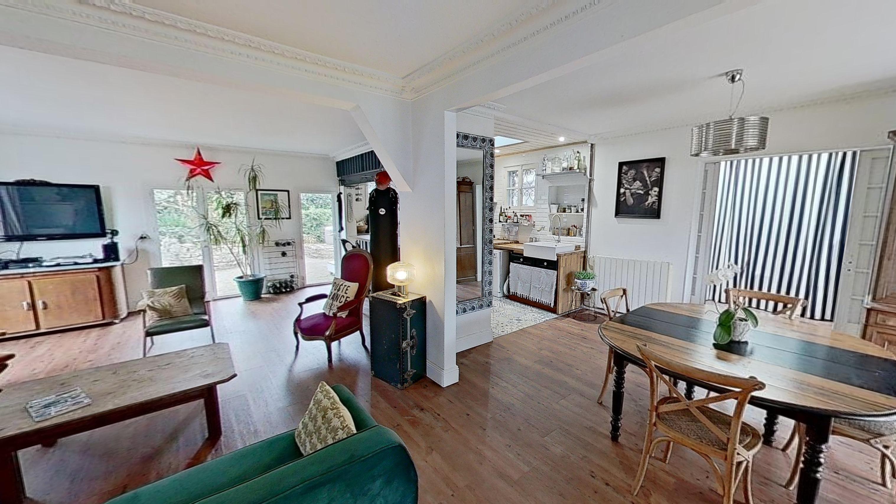 La villa se compose d’un grand séjour lumineux avec un espace cuisine, un coin repas et un salon avec cheminée, créant une atmosphère chaleureuse et accueillante.