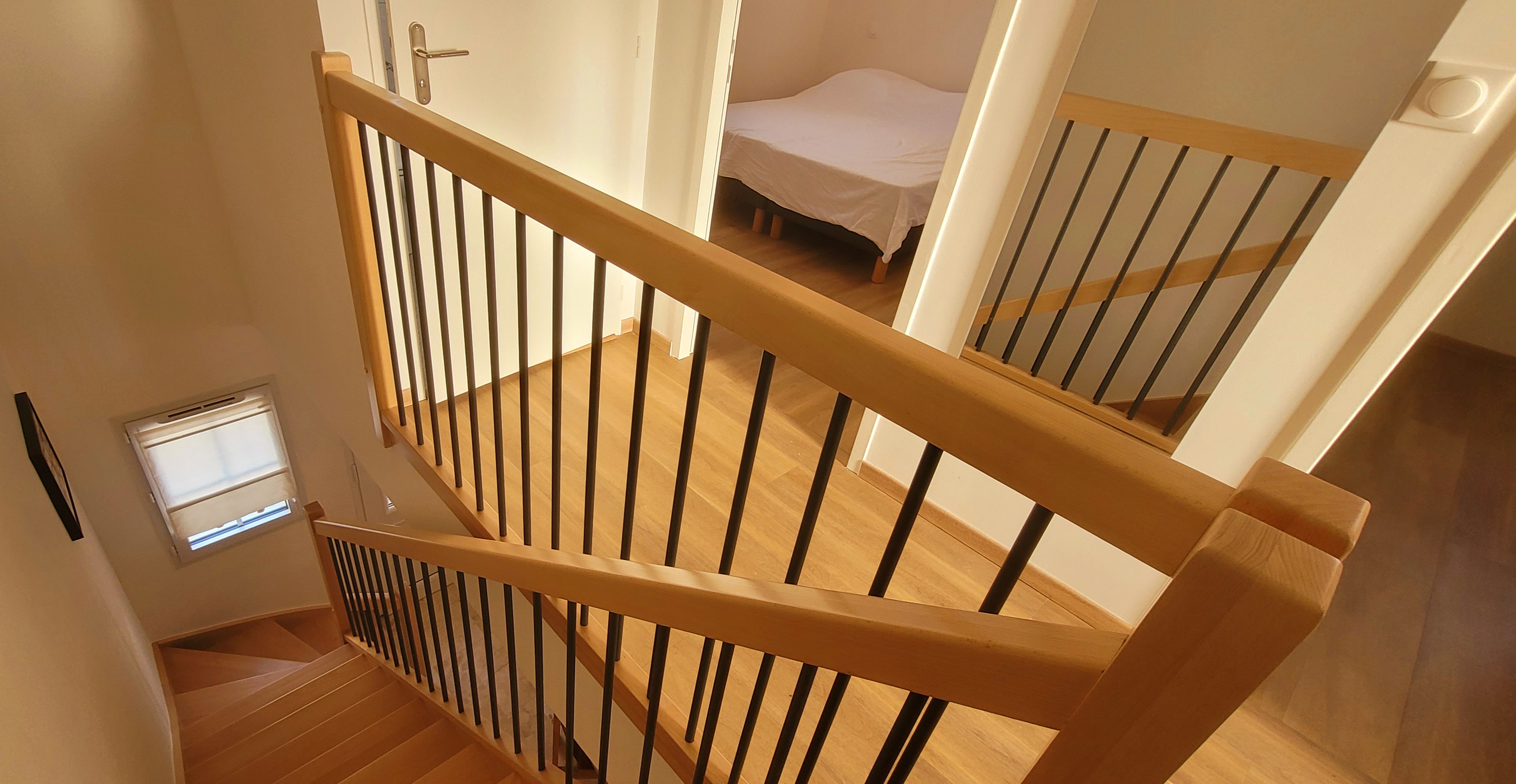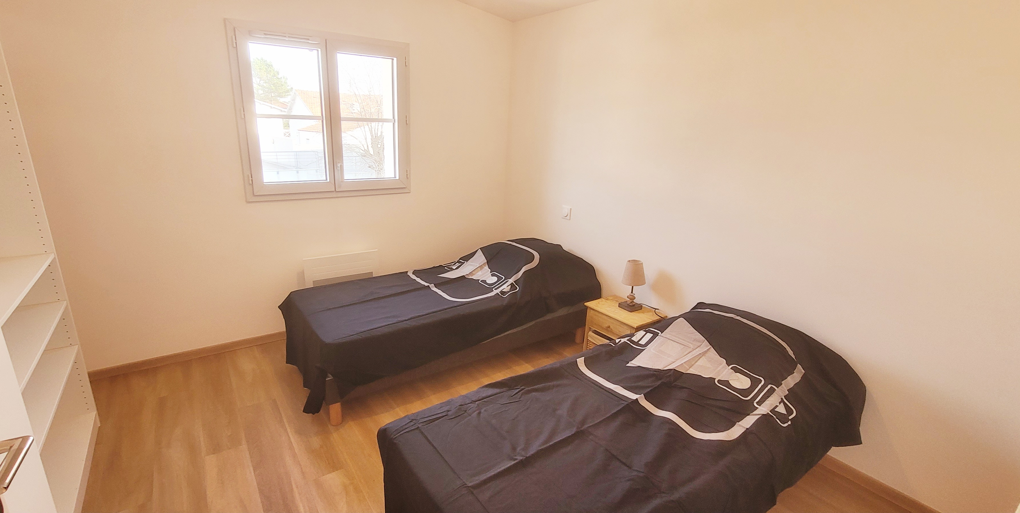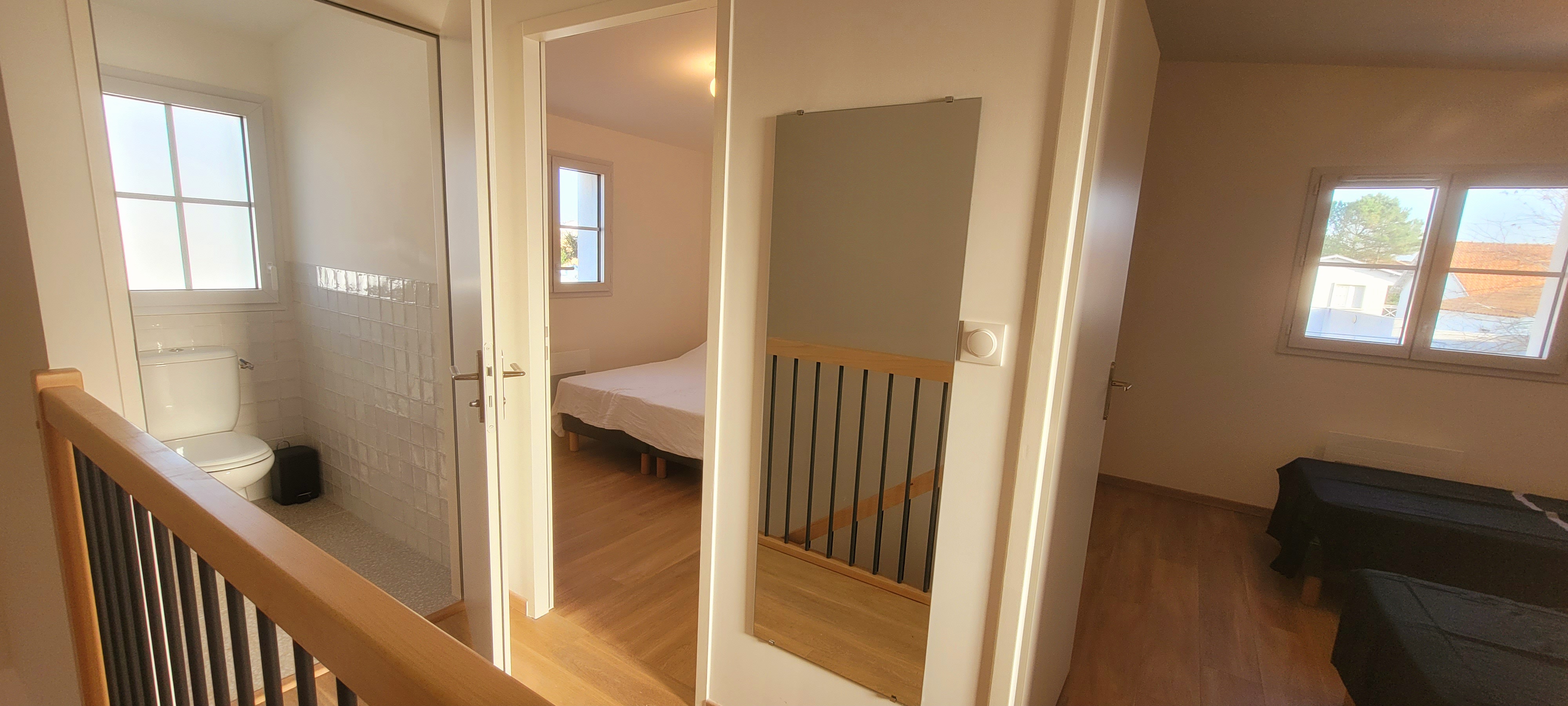A l'étage, deux chambres avec lits modulables (2*80 ou 160), une salle d'eau et un WC séparé.