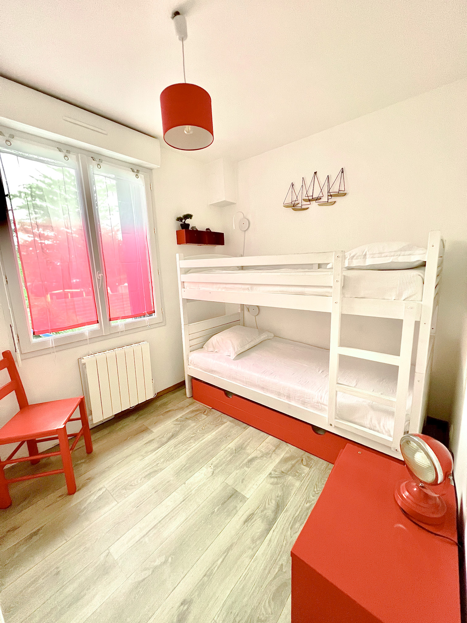 A l'étage, deux chambres, un salon avec canapé convertible, cuisine, salle d'eau et WC séparés. Un balcon.