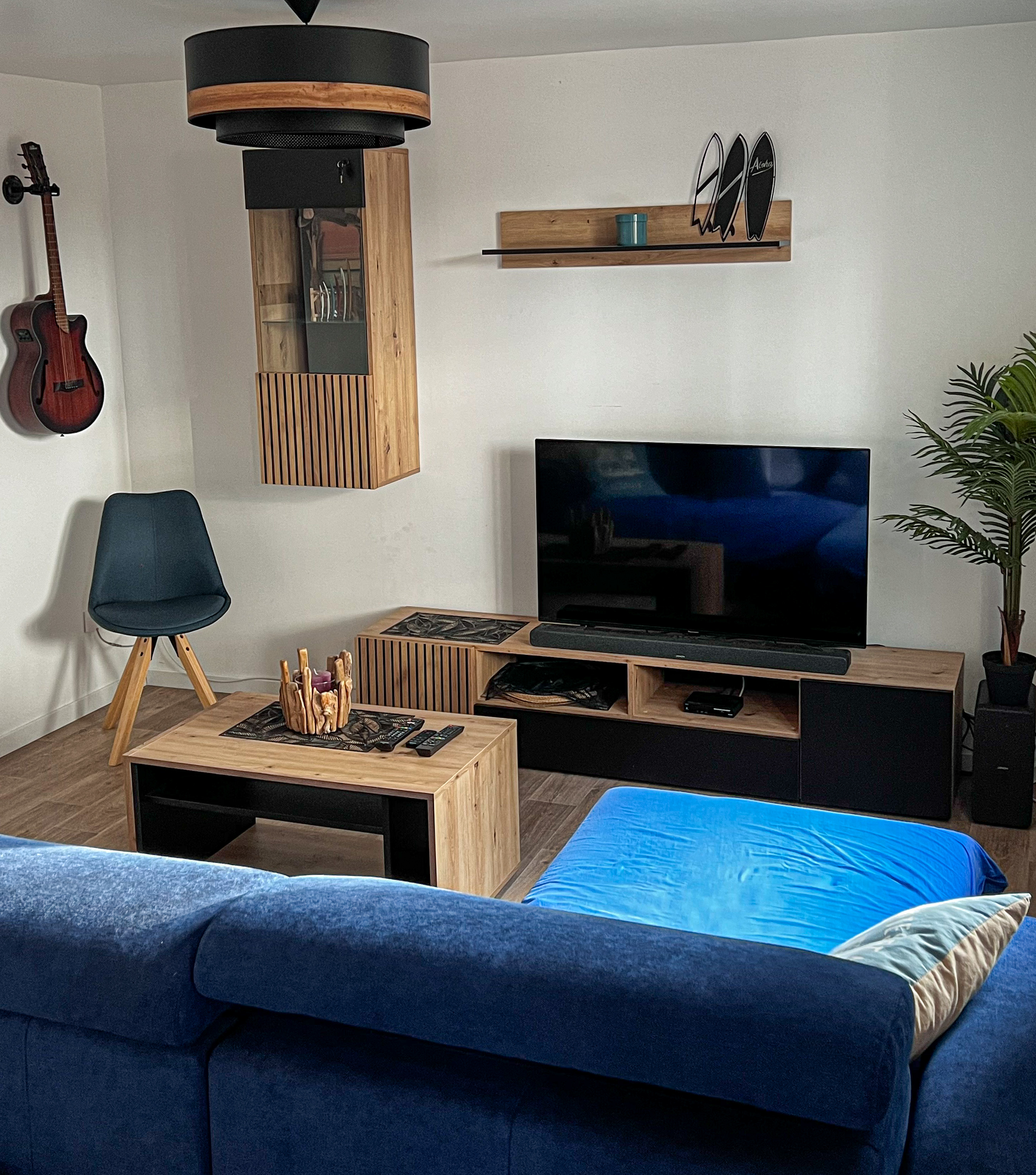 Le séjour s'ouvre sur une grande terrasse avec mobilier, transats et plancha.
