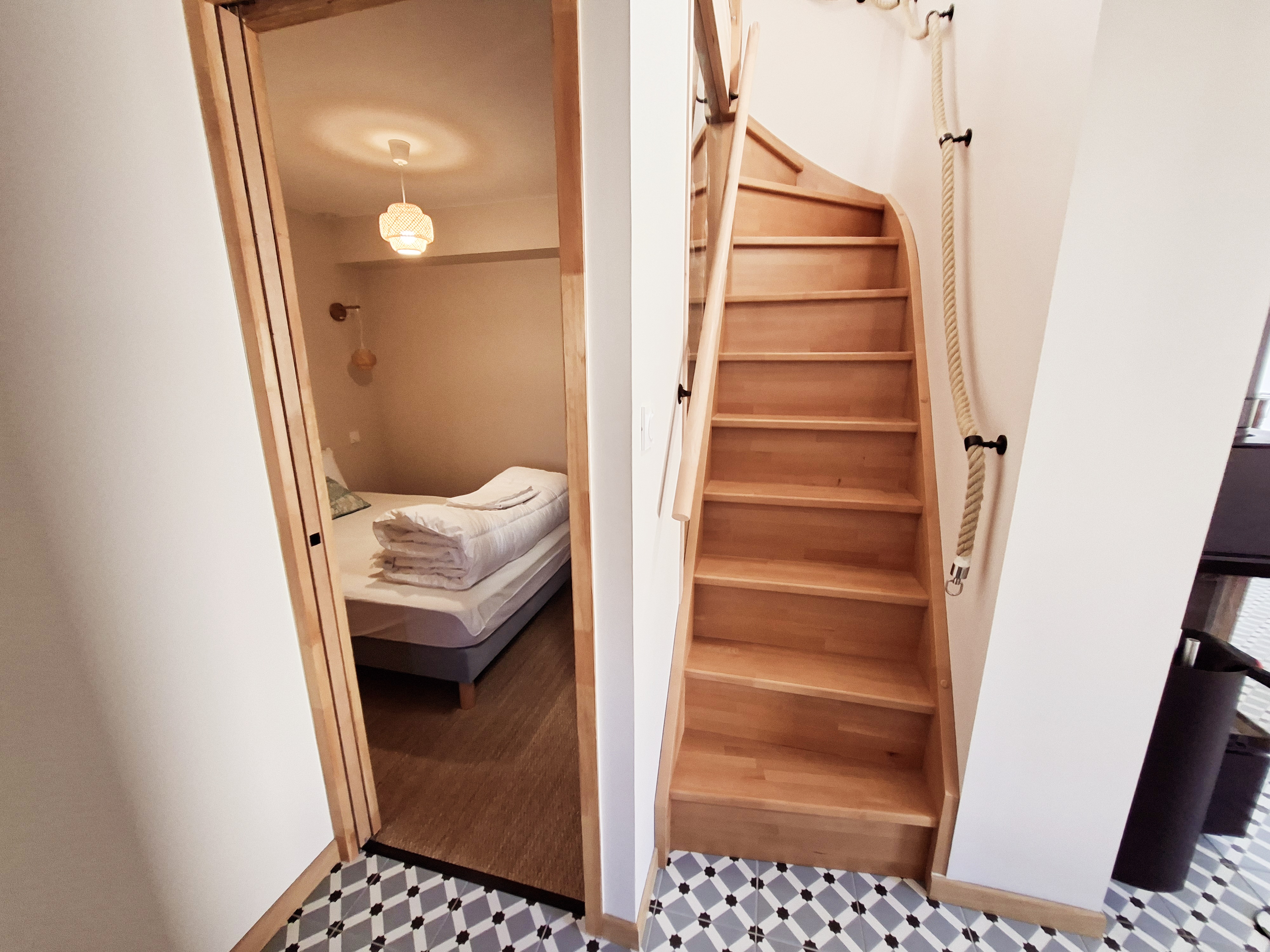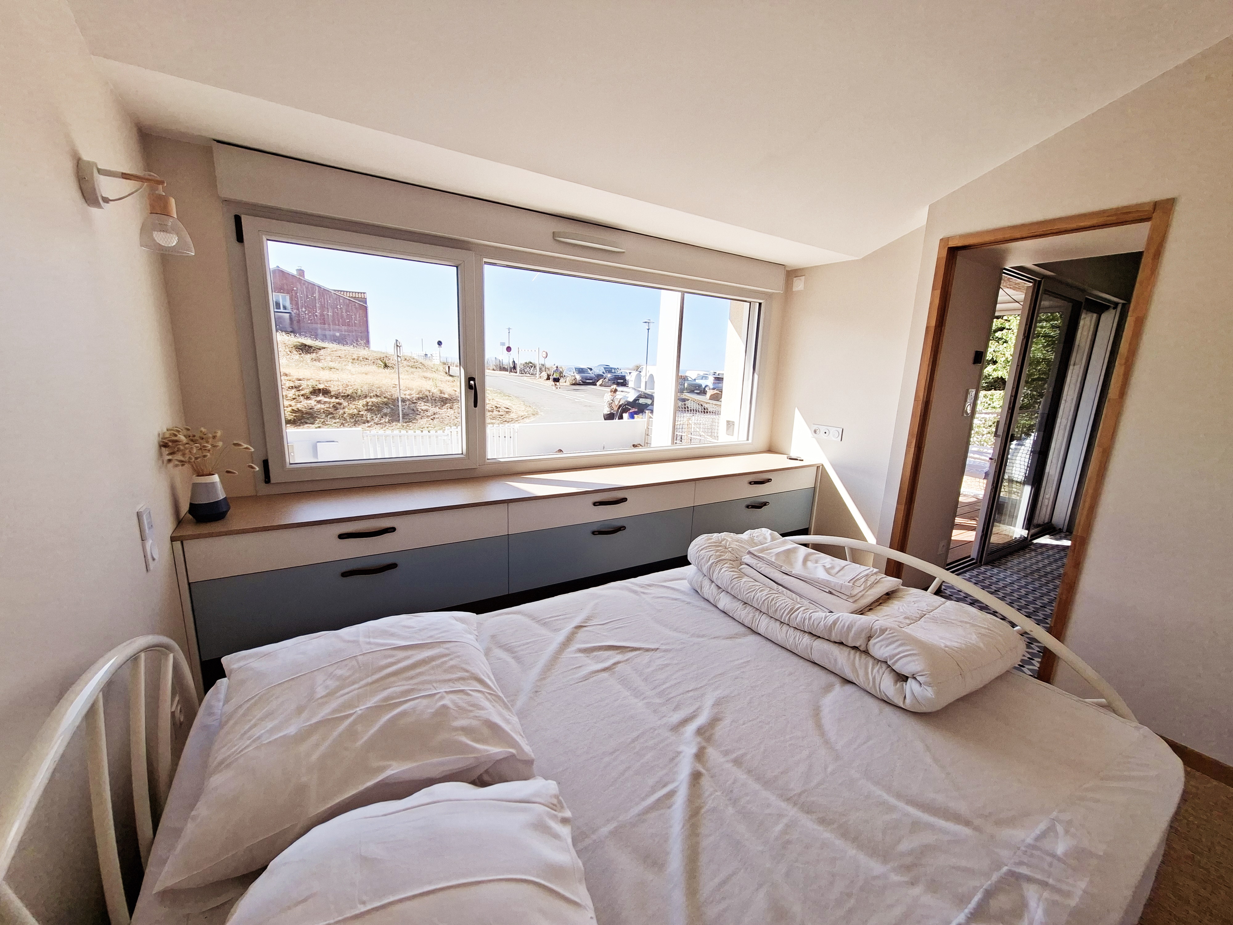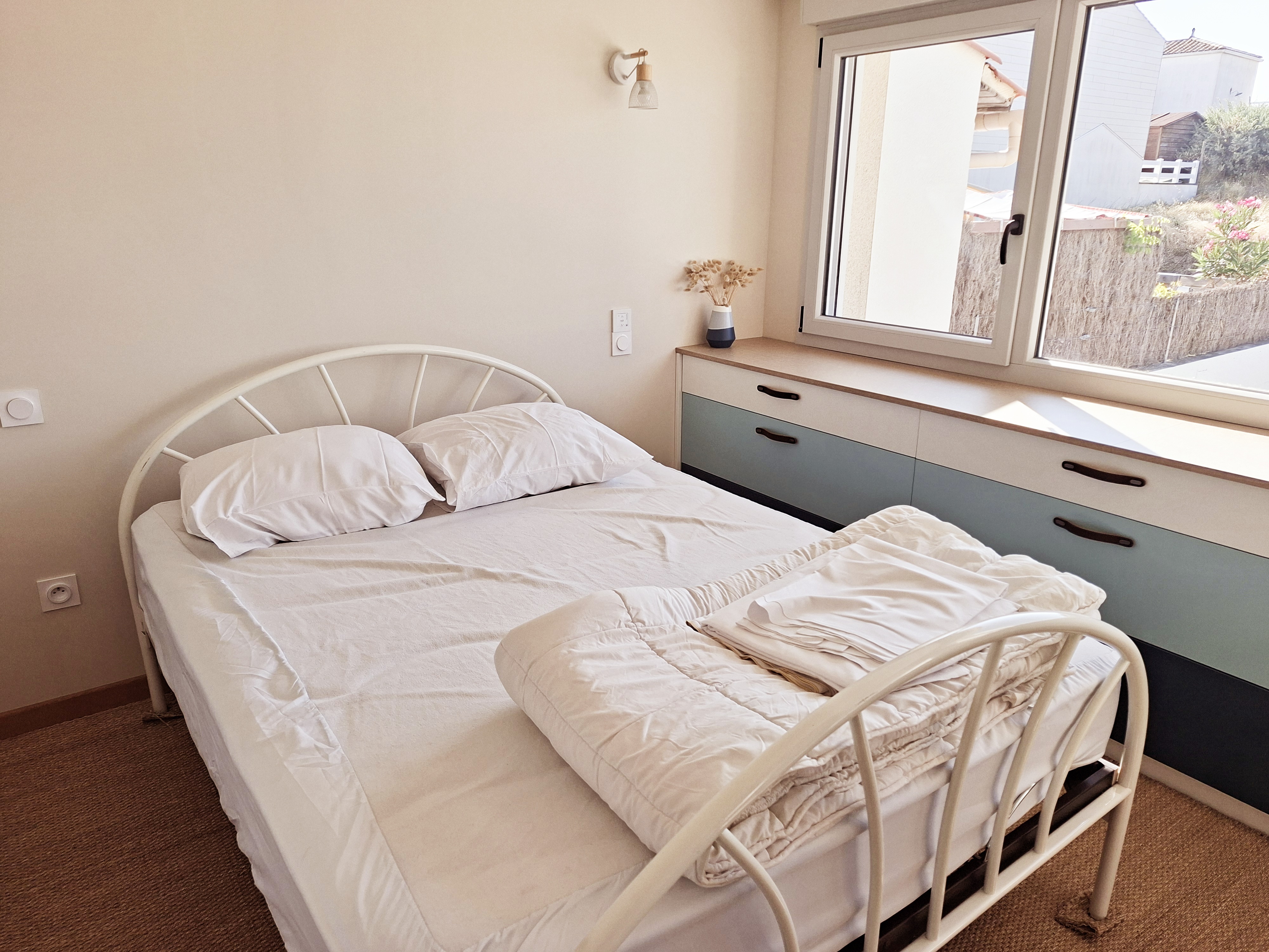 A 20 m de la plage des génerelles et 400 m du centre de la Tranche, La maison 'L'Ecume' comprend :un séjour, cuisine ouverte aménagée (four micro-onde/grill, lave vaisselle, hotte, plaque induction 2 plaques, réfrigérateur/congélateur), un salon avec TV écran plat, une chambre lit 140 avec rangement, une chambre sans ouverture lit 140 et rangement, une salle d'eau, 1 wc séparé. A l'étage une chambre plafond rampant avec 2 lits de 140, une salle d'eau, 1 wc séparé.