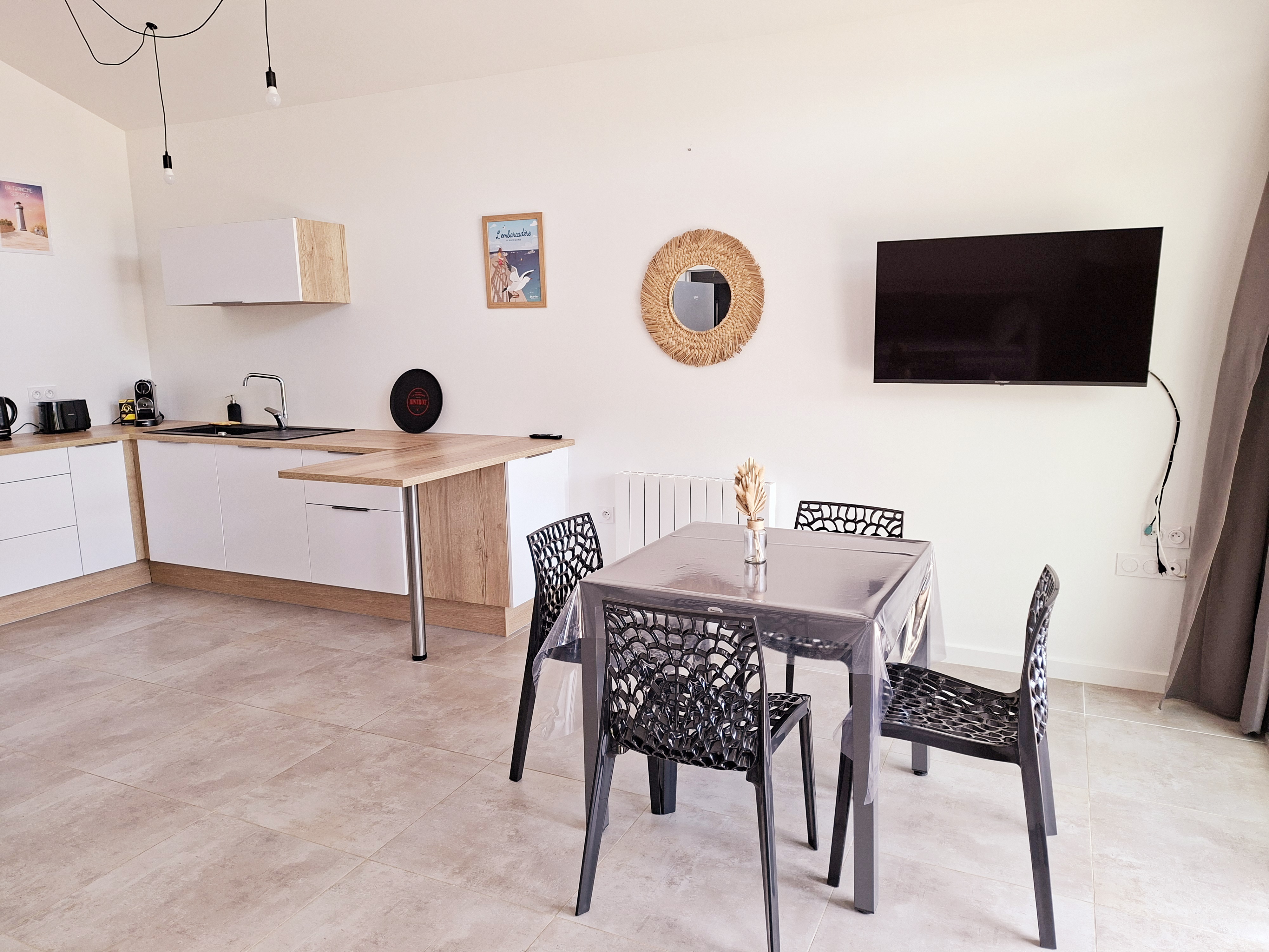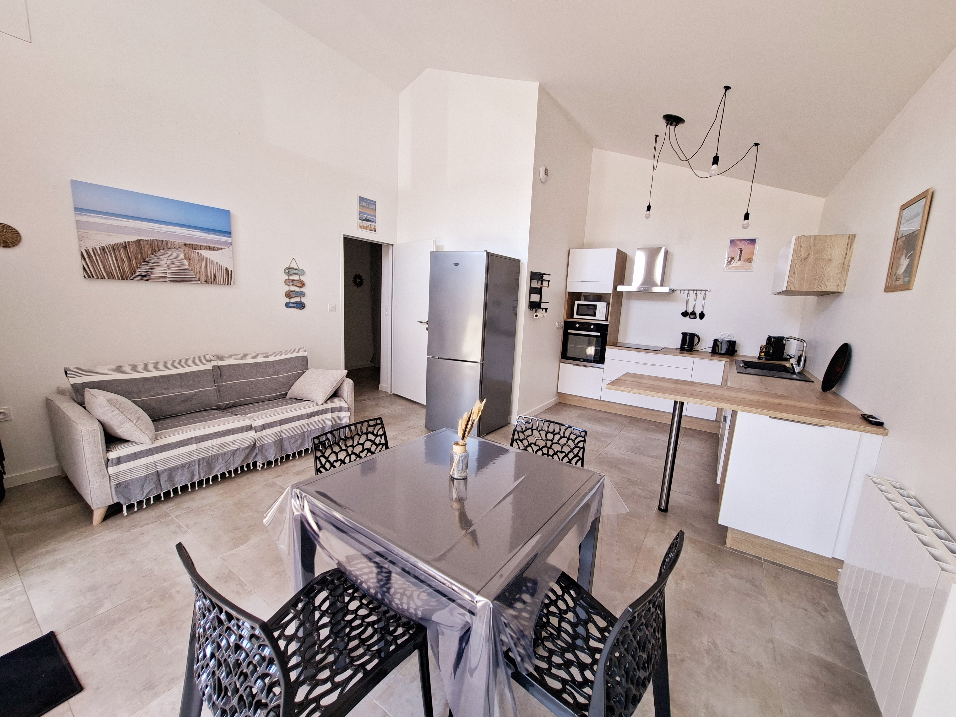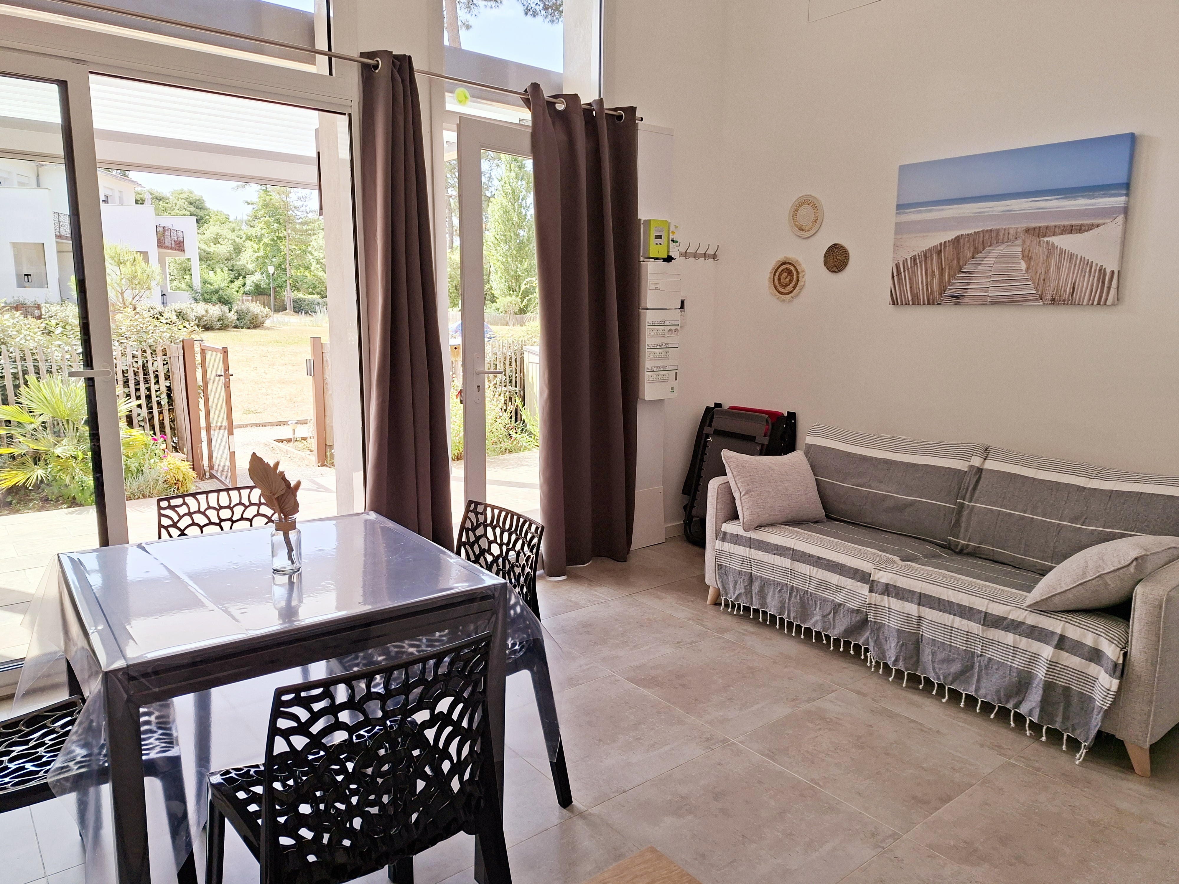 Découvrez cette maison moderne nichée dans une résidence entre mer et forêt, parfaite pour un séjour balnéaire. Alliant confort et qualité, cette habitation est idéale pour ceux qui cherchent à se ressourcer en pleine nature, au cœur d'une forêt verdoyante.La maison comprend un extérieur chaleureux, un espace de vie baigné de lumière équipé d'une cuisine moderne, d'une télévision, et d'un accès Wi-Fi. Vous y trouverez également une chambre double, une chambre cabine avec lits superposés, ainsi qu'une salle de bain avec douche, lavabo et toilettes.