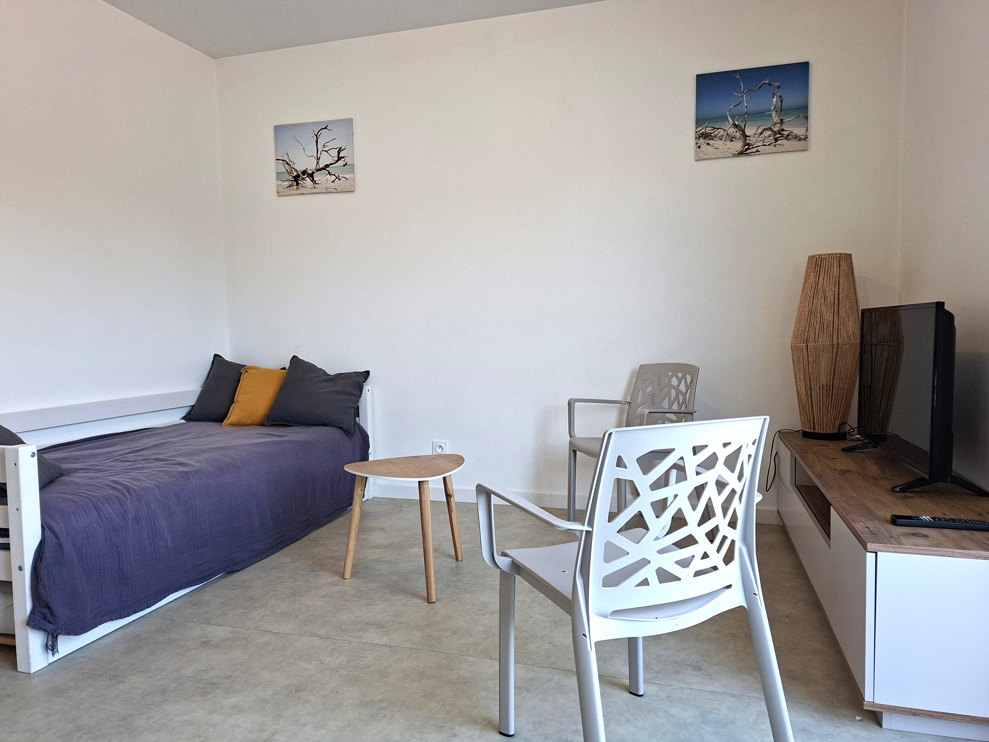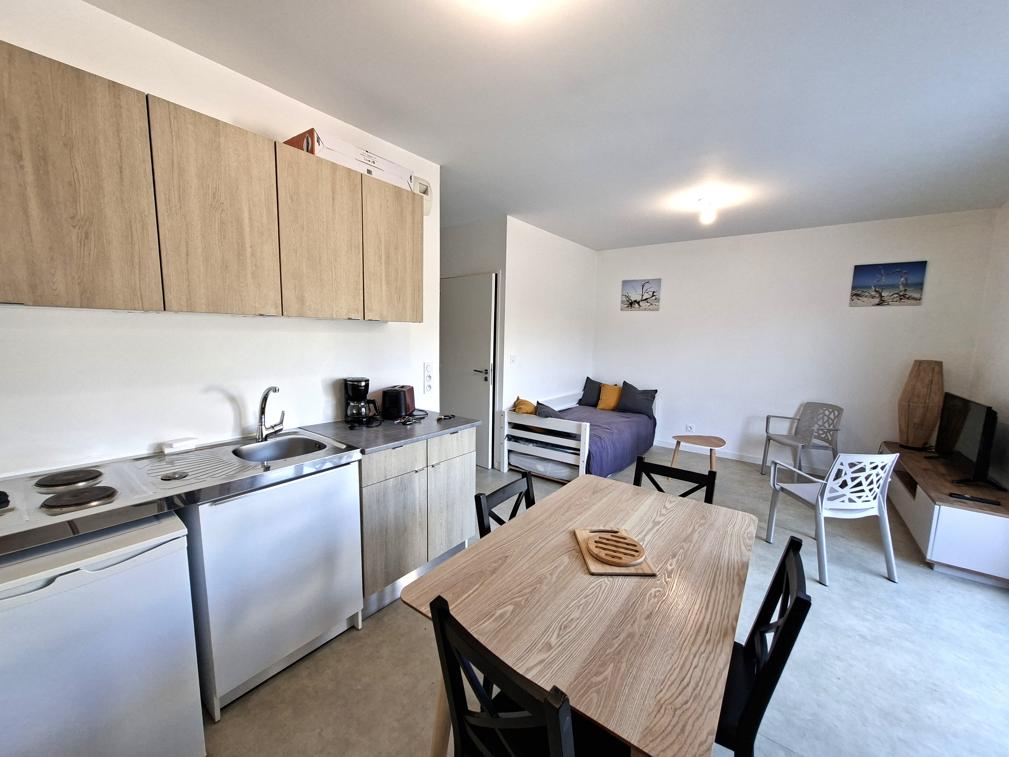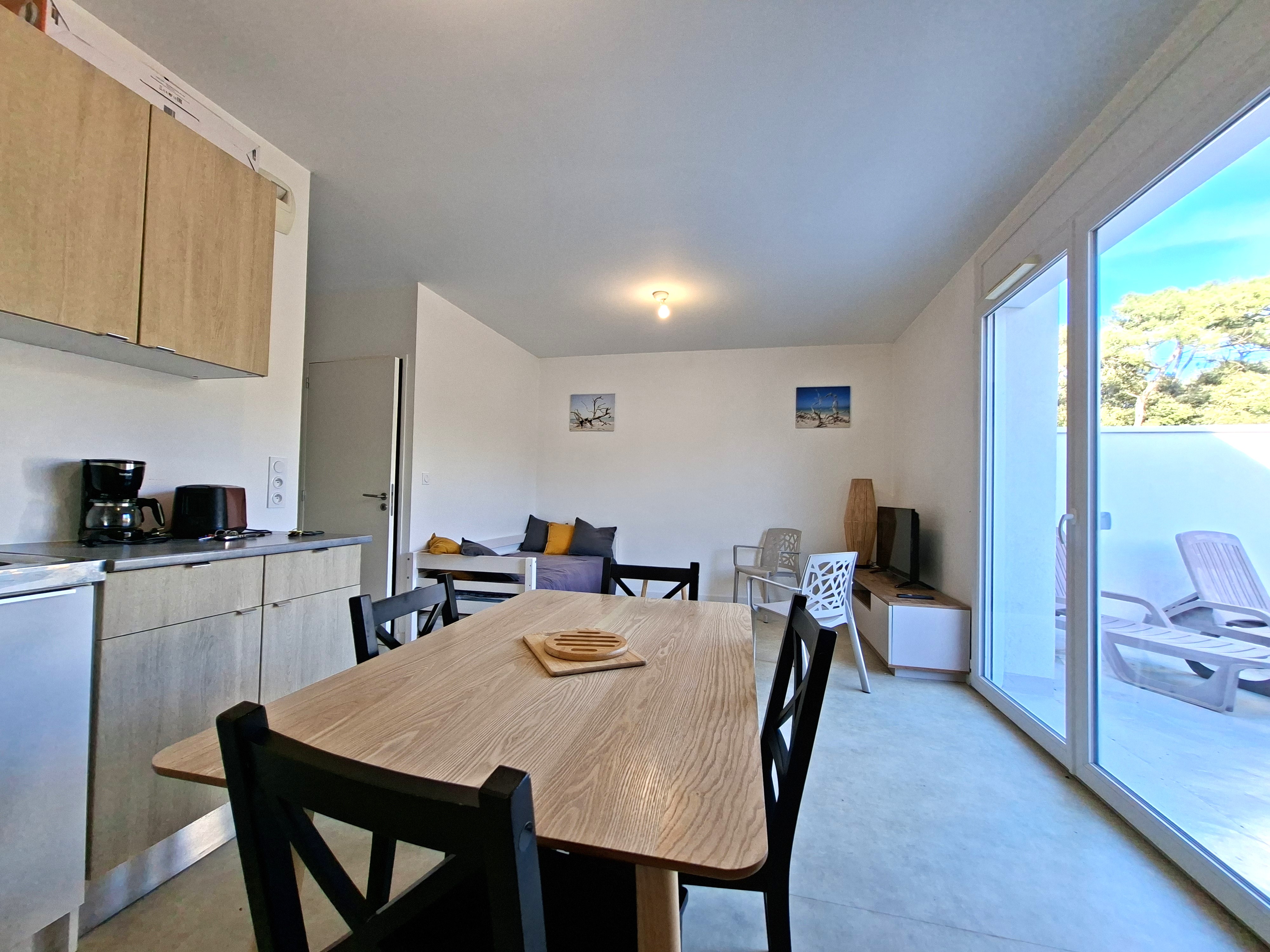 Cet appartement au premier étage de la résidence offre une belle terrasse. il est équipé d'une kitchnette (four combiné et 2 plaques électriques), d'une salle de douche, d'un espace chambre avec lit double 140cm (pas de fenêtre), d'un espace séjour / salle à manger avec table et chaises, banquette lit pour 1 personne et TV.