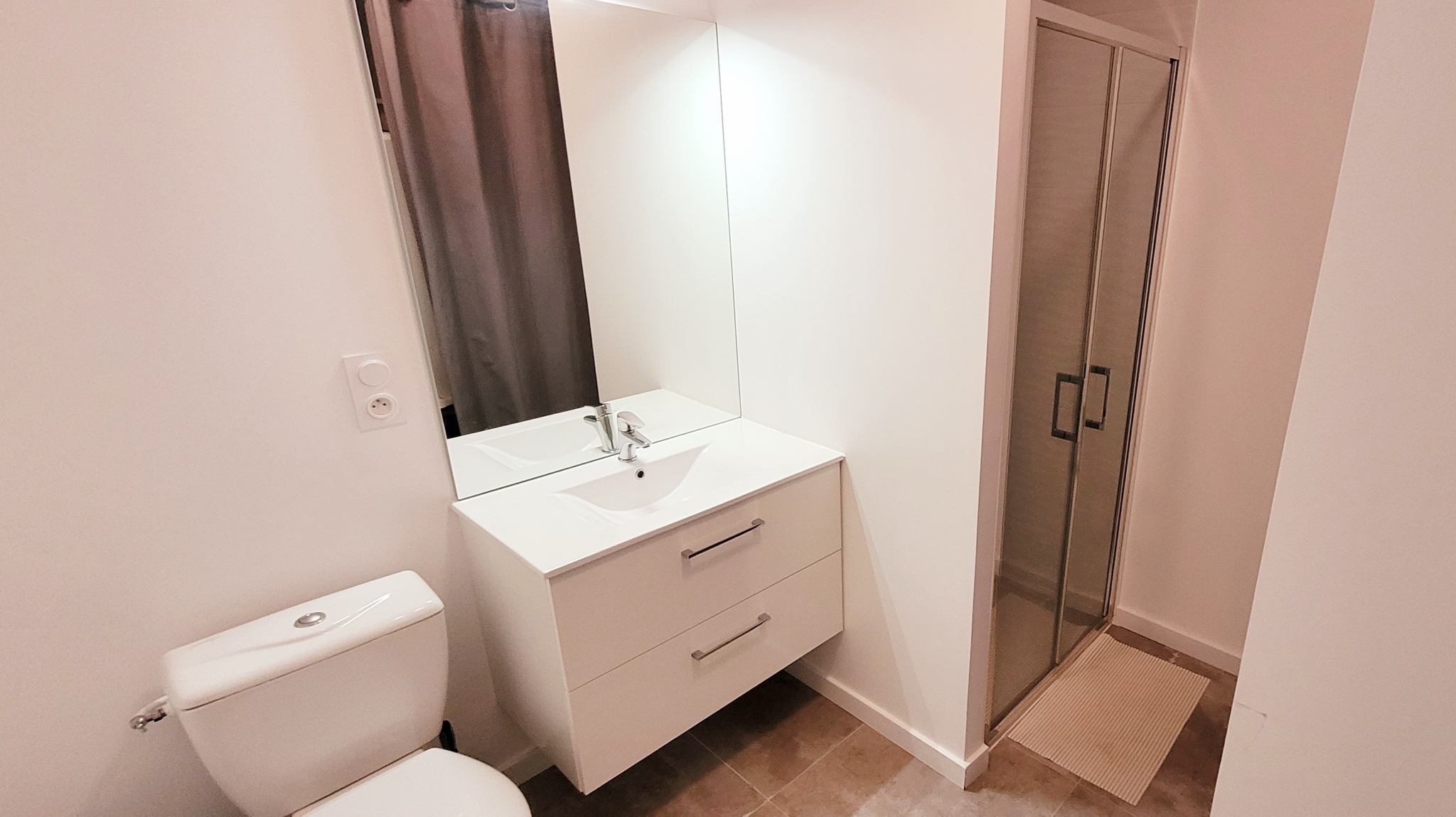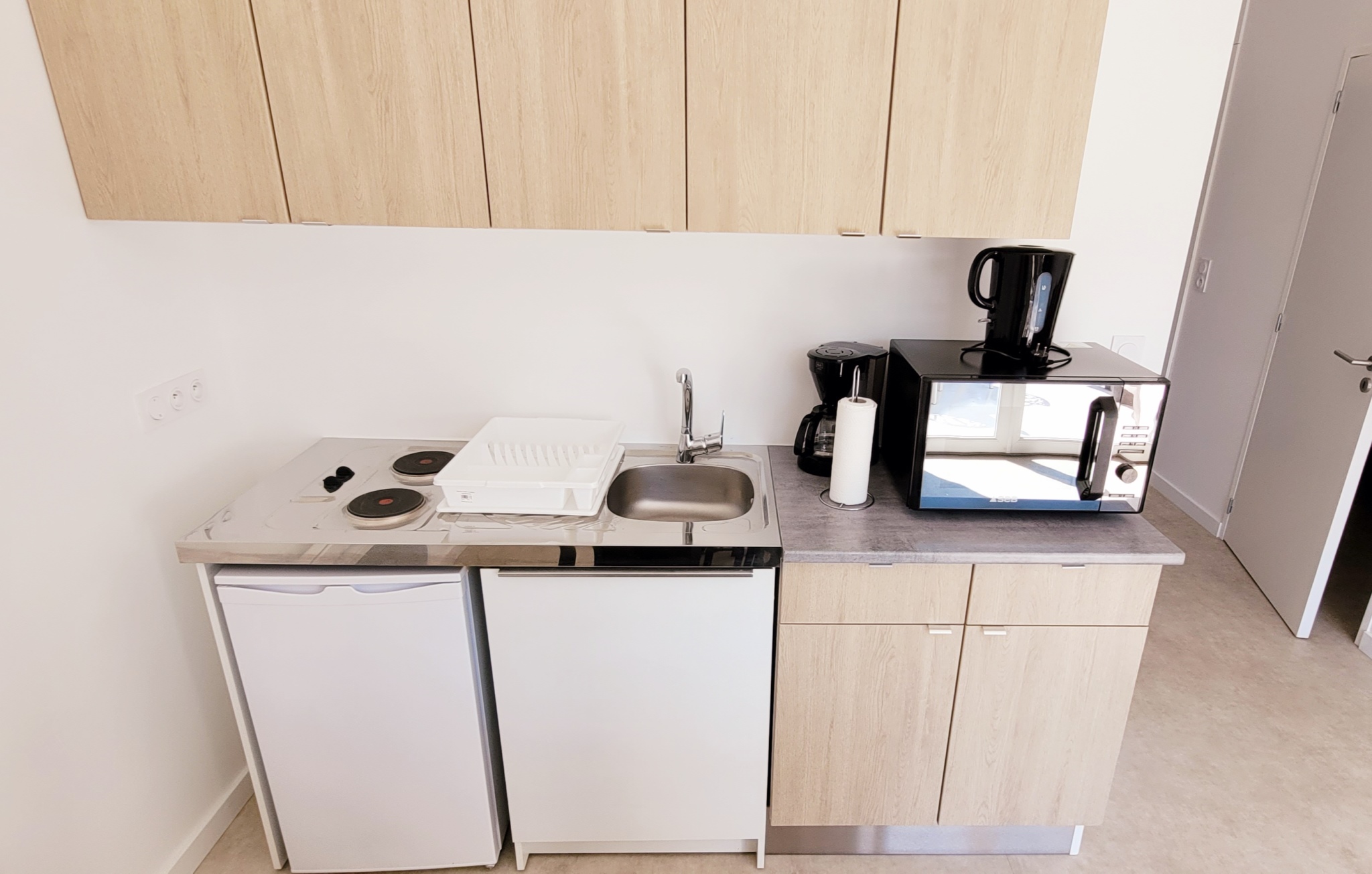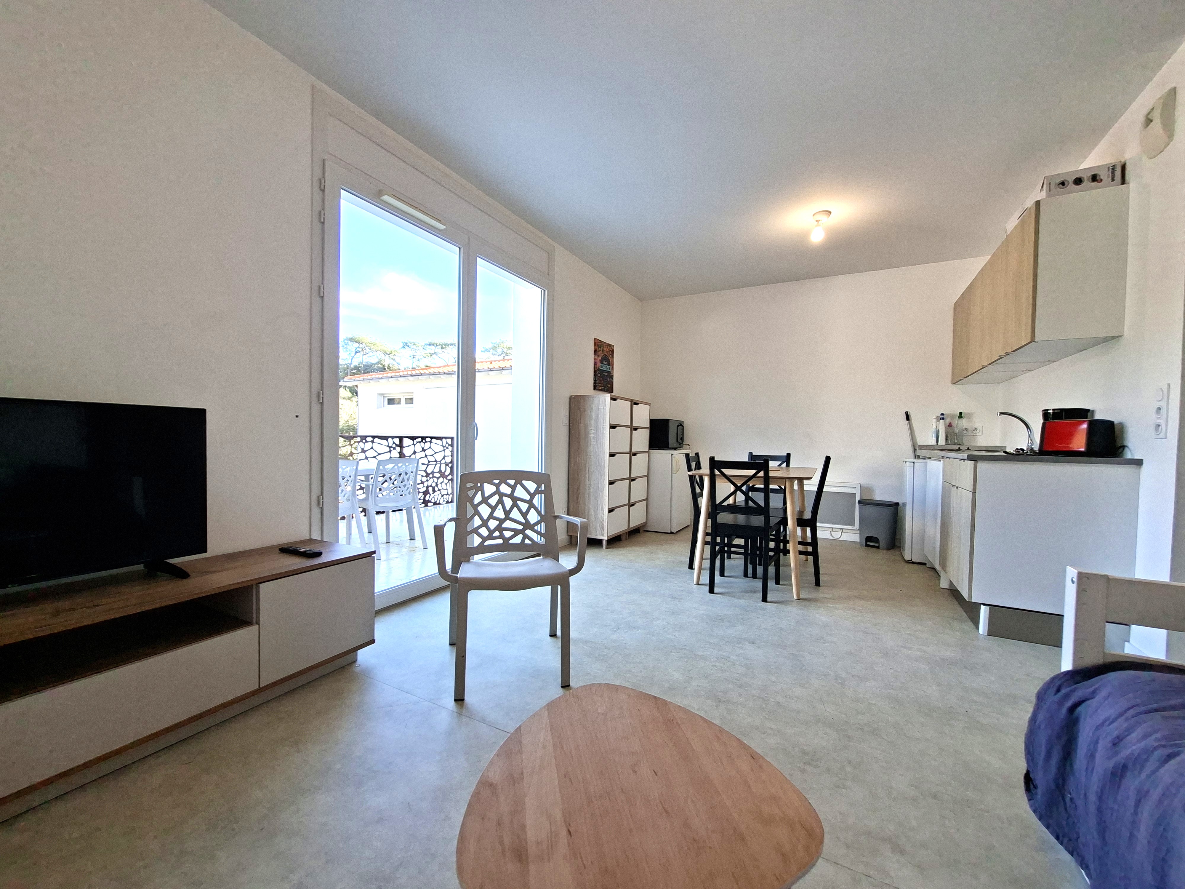 Cet appartement au premier étage de la résidence offre une belle terrasse. il est équipé d'une kitchnette (four combiné et 2 plaques électriques), d'une salle de douche, d'un espace chambre avec lit double 140cm (pas de fenêtre), d'un espace séjour / salle à manger avec table et chaises, banquette lit pour 1 personne et TV.